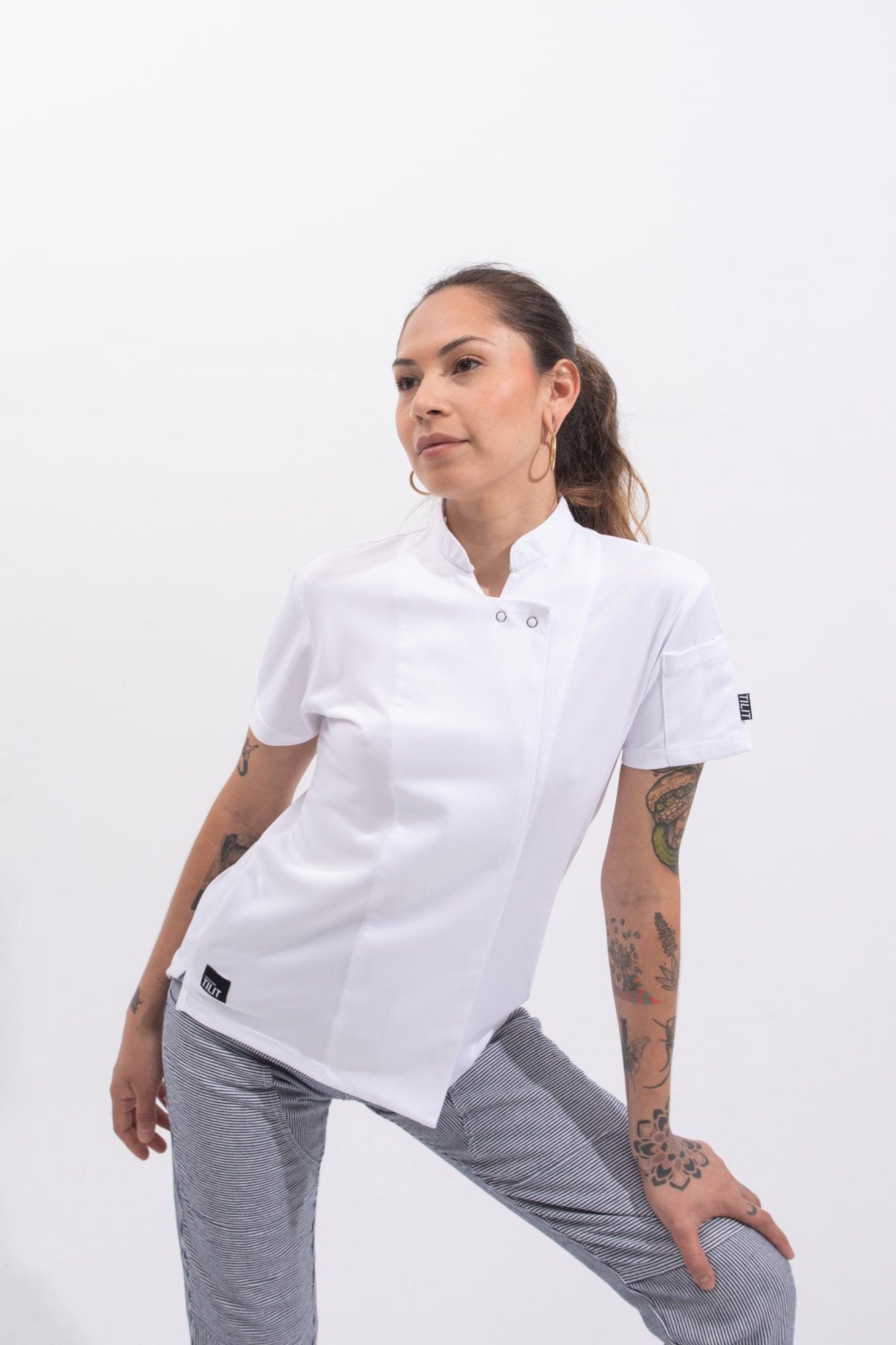 The Everyday Essential Chef Jacket This a modern take on the chef coat with functional details and a female specific fit that will fill your wardrobe for the work week. Constructed of a moisture wicking, lightweight knit fabric that can stand the heat of a 12 hour shift and bounce back with a normal wash cycle. packed with details and a fit that doesn't feel like a box. Made in Colombia from a polyester knit fabric complete with apron neck tab and sleeve pocket. This coat has a natural stretch to it due to the weave of the fabric. Black chef coats are made from 100% recycled fabrics. Tilit Supply is a collection of essential uniform styles built to withstand the heat of the kitchen and perform everyday of the week.