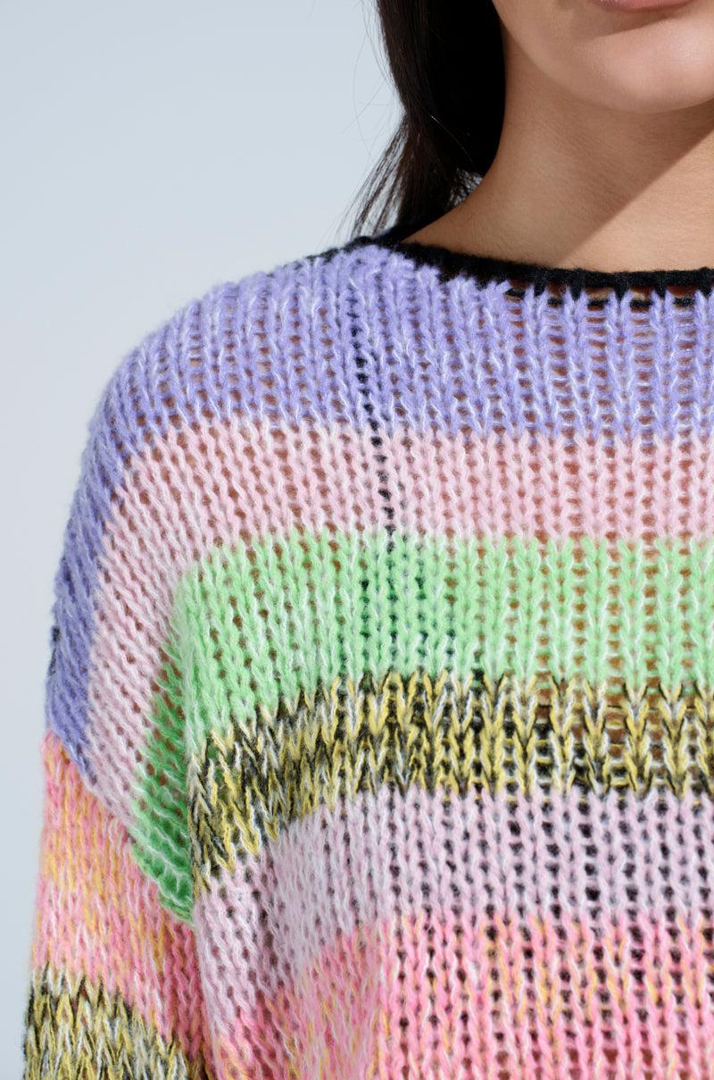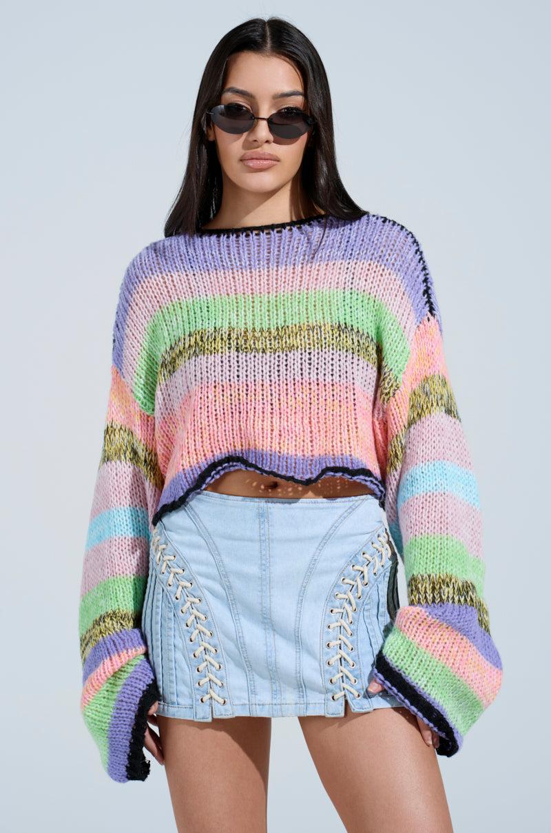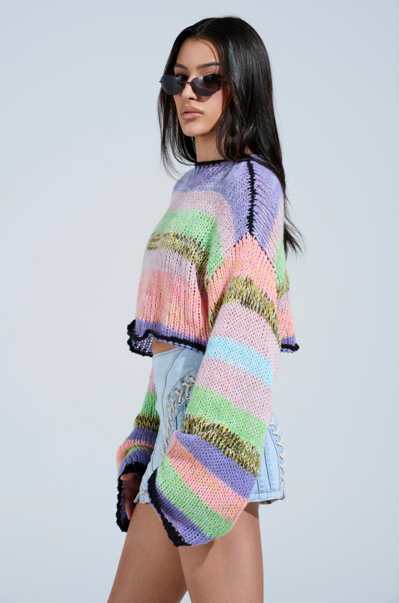 Spring sweaters are back! The AKIRA Label Sure Thang Sweater is a super soft and stretchy knit style featuring a cropped, oversized silhouette, a boat neckline, long bell sleeves, and a colorful, chunky striped pattern throughout. - 100% Polyester- Hand Wash Cold- Stretchy- Imported (all measurements approximate from size small)- 17” Shoulder to Hem- 24” Shoulder to Shoulder- 25” Sleeves- Model is 5’7” and wearing a size smallProduct ID: 1025487