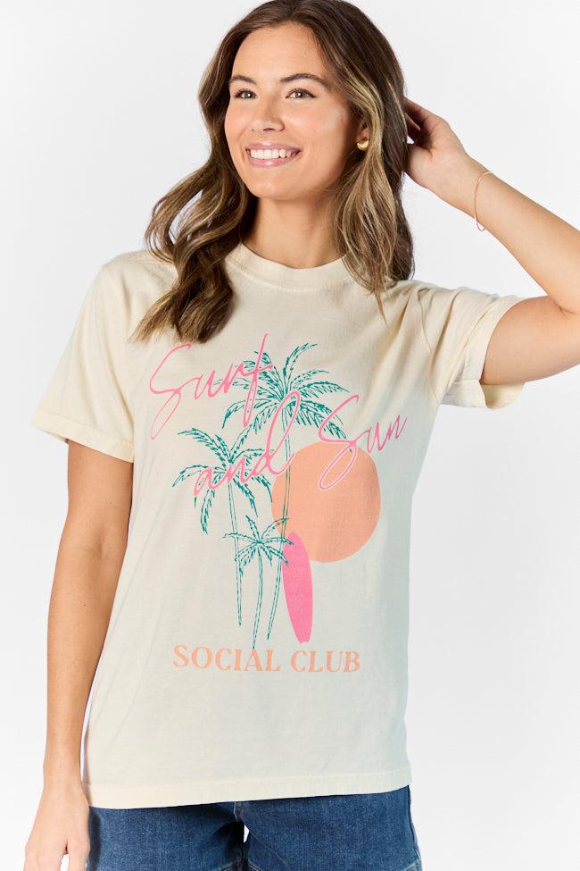 Details Ivory t-shirt with vacation palm tree sun surf board design Relaxed fit, size up 2 sizes for an oversized fit Crew neckline, short sleeves Size small from shoulder to hem: 28" Material and care Comfort Color Tee 100% cotton Machine wash cold, hang dry Materials may have natural variations Colors may vary from different viewing devices. PLEASE NOTE: You may notice some off-white residue or slight discoloration when you first receive your shirt. Please do not worry! This comes from the special solution we use for printing the design on your shirt. It can sometimes leave marks during the drying process. These are not stains and will wash off after the first wash cycle. To keep your shirt's design as beautiful as possible, we do recommend washing this garment inside out on the gentle cycle with cold or lukewarm water. You can either tumble dry low or line dry.