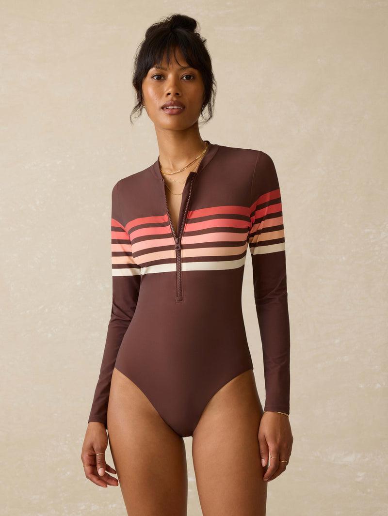 Our adventure-ready rashguard is crafted from recycled nylon and LYCRA® XTRA LIFE™, a spandex (elastane) fiber that resists damage caused by sun, heat, chlorine and lotion. An easy crew neck and long protective sleeves frame our iconic nautical stripe for a sun-drenched look while you play in the waves. Shop confidentl