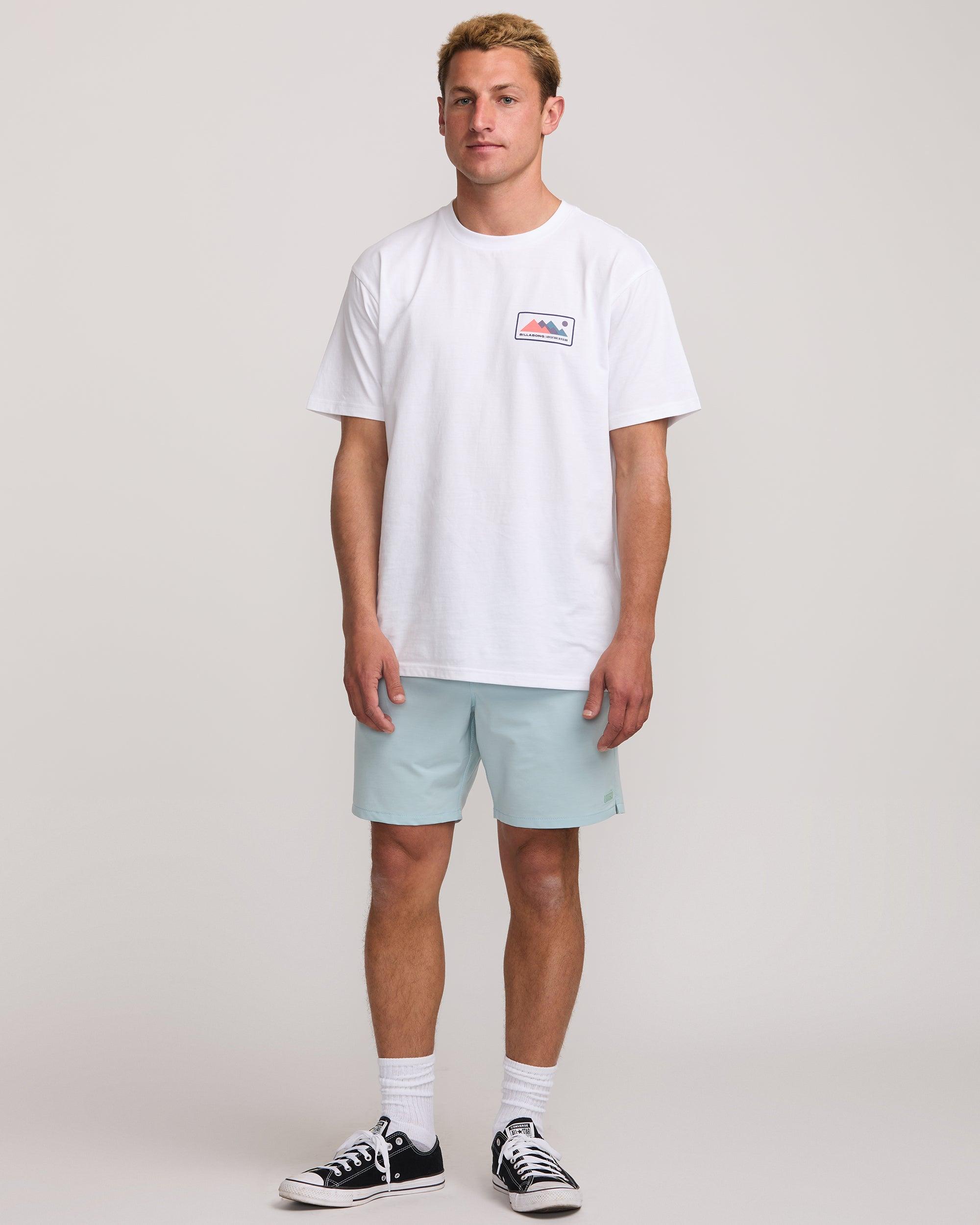 Stretchy, quick-dry hybrid shorts bring active comfort to every adventure. Moisture-wicking stretch fabric, relaxed regular fit, and adjustable elastic waist ensure all-day flexibility. Bonus: Multiple pockets stash all your essentials for seamless transitions from surf to street. Featured here in the Dusty Blue colorway. Features 4-Way Stretch 17" Outseam Regular Fit Elastic Waistband With Drawcord Closure Hand Pockets, Back Zipper Pocket Back Cord Loop Silicone Badge, Woven Label Moisture Wicking, Quick Dry