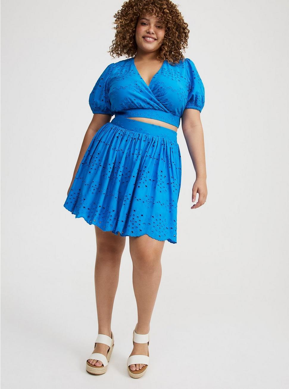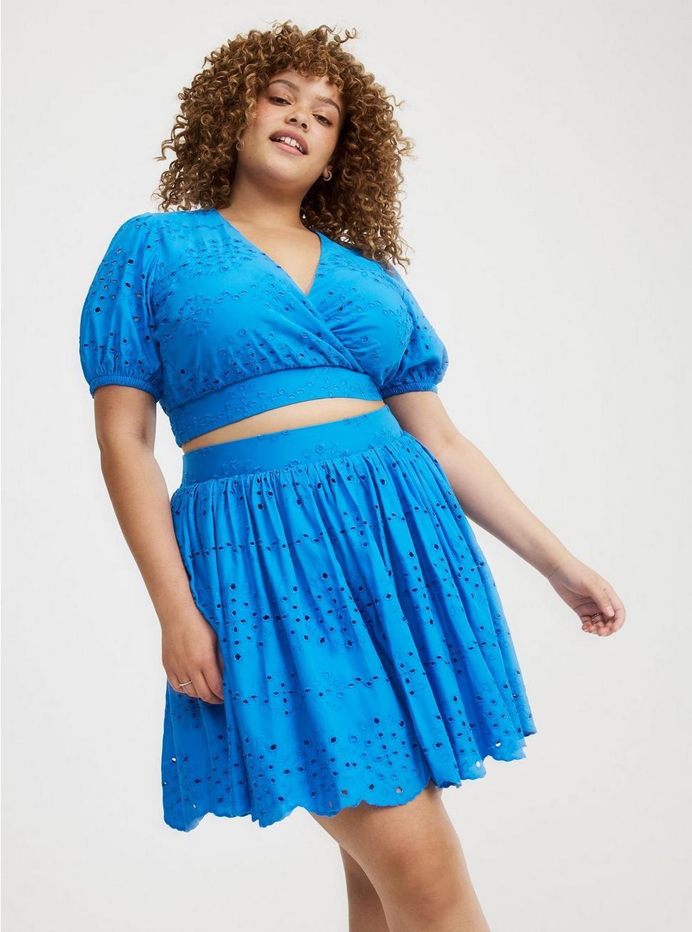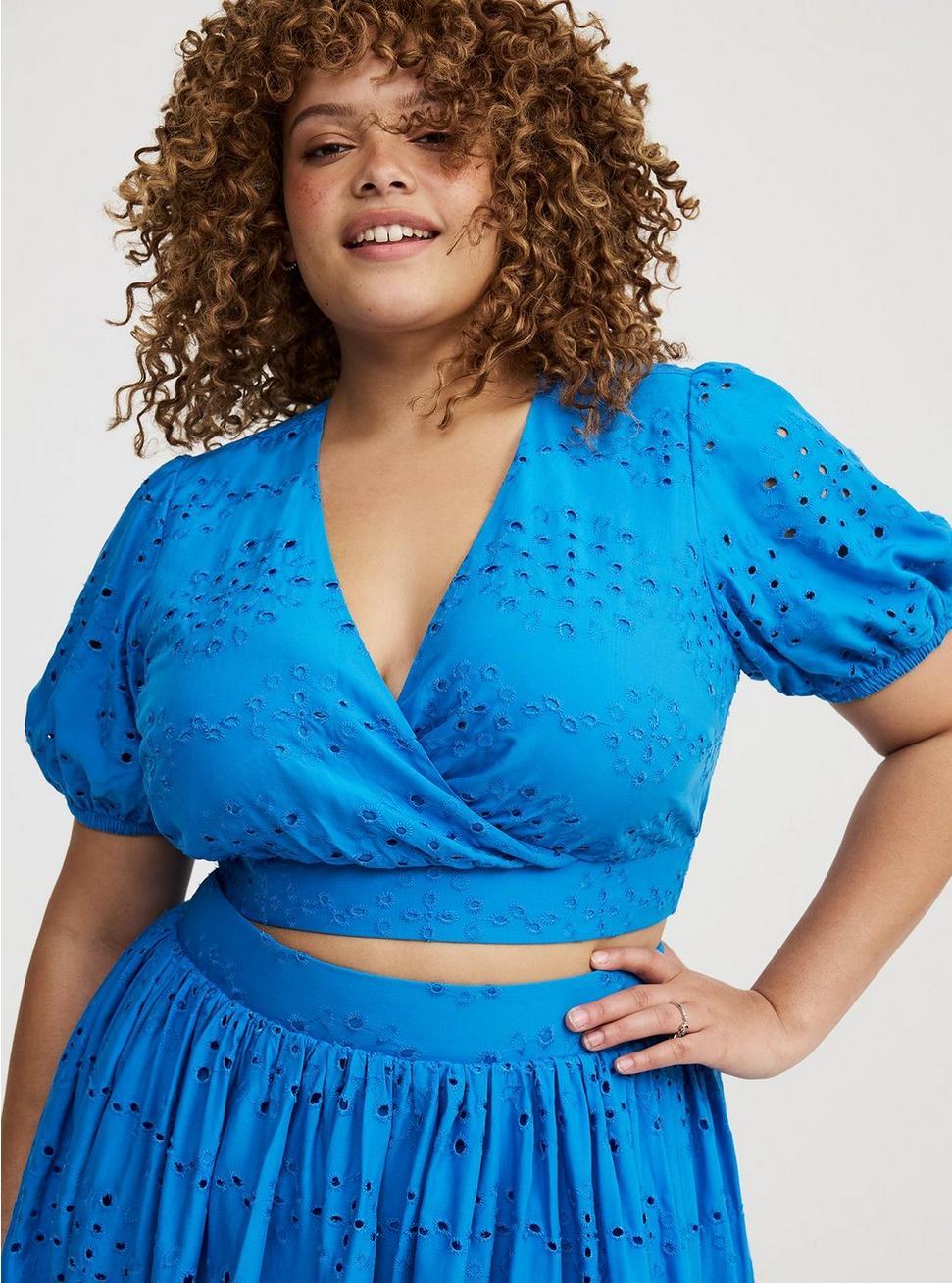 FITMeasures 39'' from shoulder (size 2). MATERIALS + CAREChallis woven fabric: Your favorite easy-but-polished fabric.Stretch level: None.100% rayon.Machine wash cold. Line dry.Imported.DETAILSV-shaped, surplice neckline.Short puff sleeves.Back neck button closure. Scalloped hem.