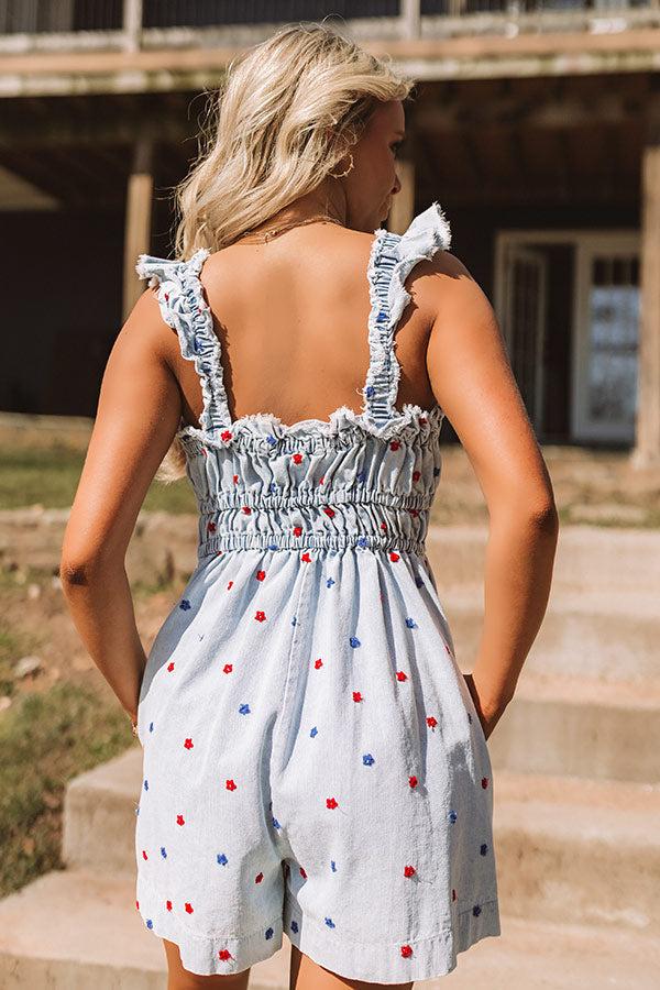 - This darling denim romper is as cute as can be! The red and blue floral embroidery and pleated details keep it playful for lake days, fire pit nights, and summer getaways. - Unlined denim material with red and blue floral embroidery -A scoop neckline with frayed detailing - A pleated bodice with a smocked back - Short flutter sleeves with frayed detailing - A waistline with an elastic back - Hidden side pockets - A flattering silhouette that ends in relaxed, upper-thigh length hemlines Measurements S : Bust 30", Hip 36", Inseam 3.5", Length 24", Torso 22.5", Waist 27". M : Bust 32", Hip 38", Inseam 4", Length 25", Torso 23.5", Waist 29". L : Bust 34", Hip 40", Inseam 4", Length 25.5", Torso 23.5", Waist 31".