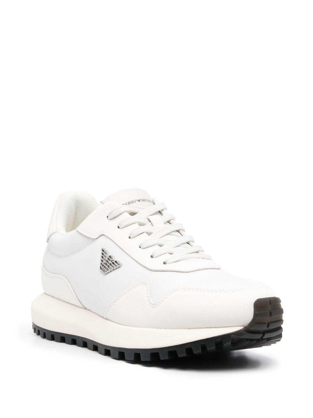 Emporio Armani Sustainability Values low-top sneakers | White | white | recycled polyester/calf leather | panelled design | silver-tone logo plaque | logo patch at the tongue | round toe | front lace-up fastening | branded insole | EVA midsole | ridged rubber sole | Recycled Polyester/Calf Leather/Fabric/Rubber | Low-Tops | Sneakers | Shoes | Men