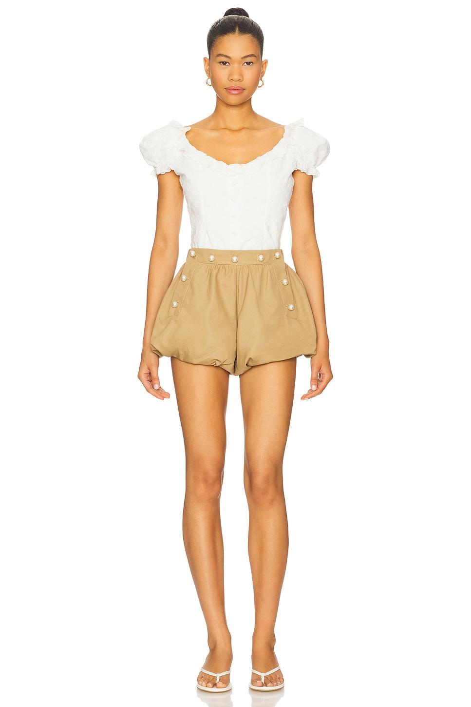 Self & Lining: 100% cotton. Dry clean only. Front and side faux pearl button closures. Back welt pockets. Twill fabric with bubble hem design. Shorts measure approx 11" in length. Made in China. Revolve Style No. SEA-WF5. Manufacturer Style No. PF25-091.