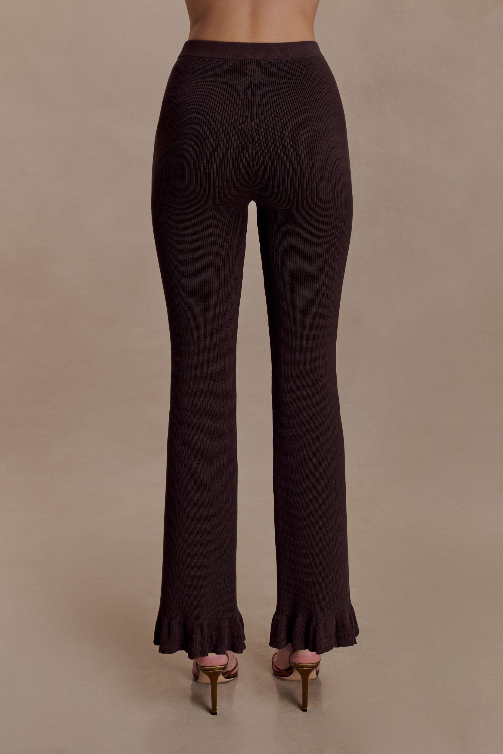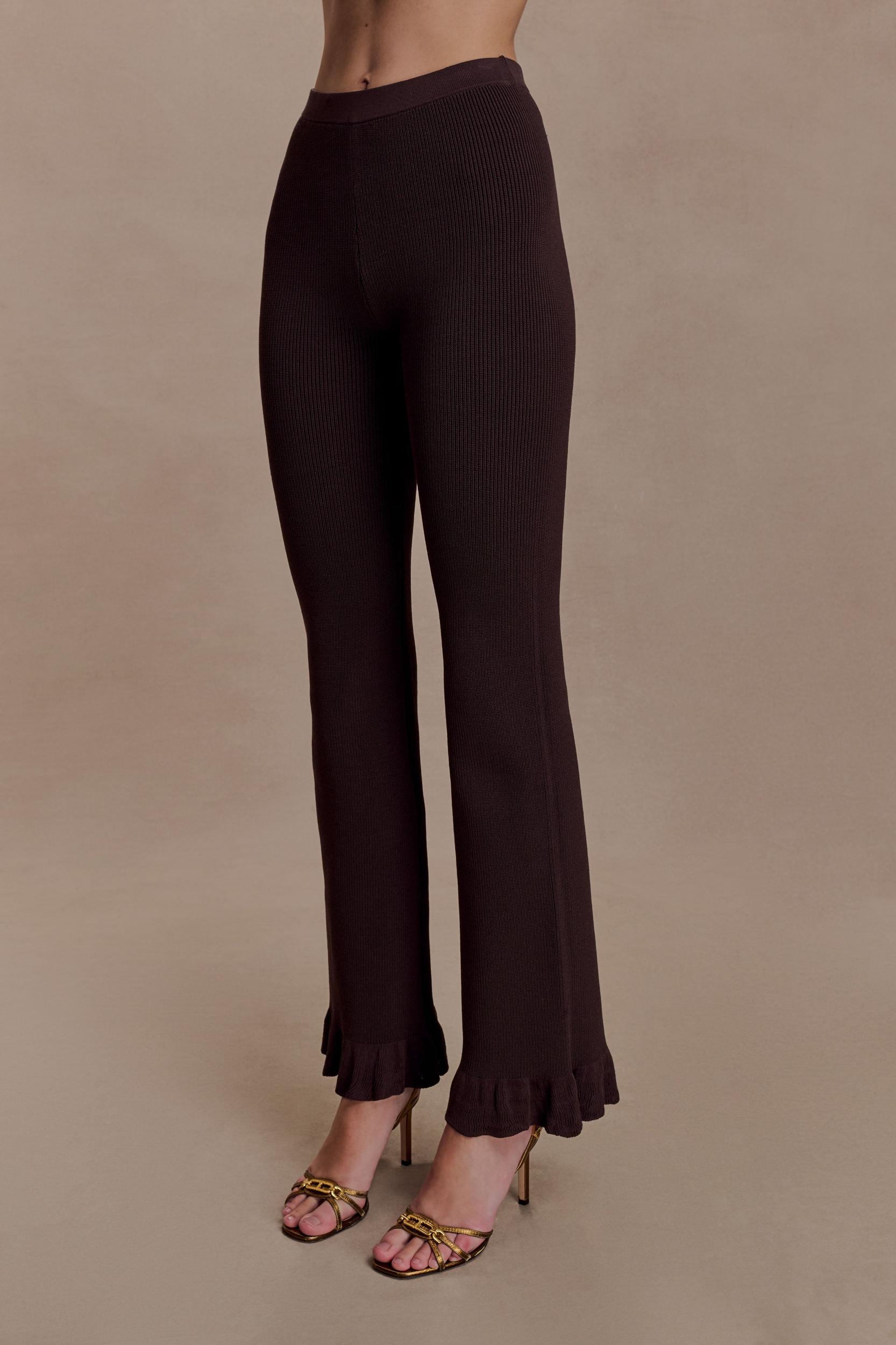 Sleek lines, effortless movement. The SUZIE Ribbed Flared Pants bring a modern edge to everyday knitwear. Designed with a mid-rise elasticated waist, they offer a comfortable, body-hugging fit through the hips before falling into a softly flared hem. Crafted in a ribbed knit fabrication, this silhouette elongates the leg while maintaining a streamlined feel. Polished yet easy, these pants are made for elevated styling — equally suited to relaxed looks or refined, after-dark moments.