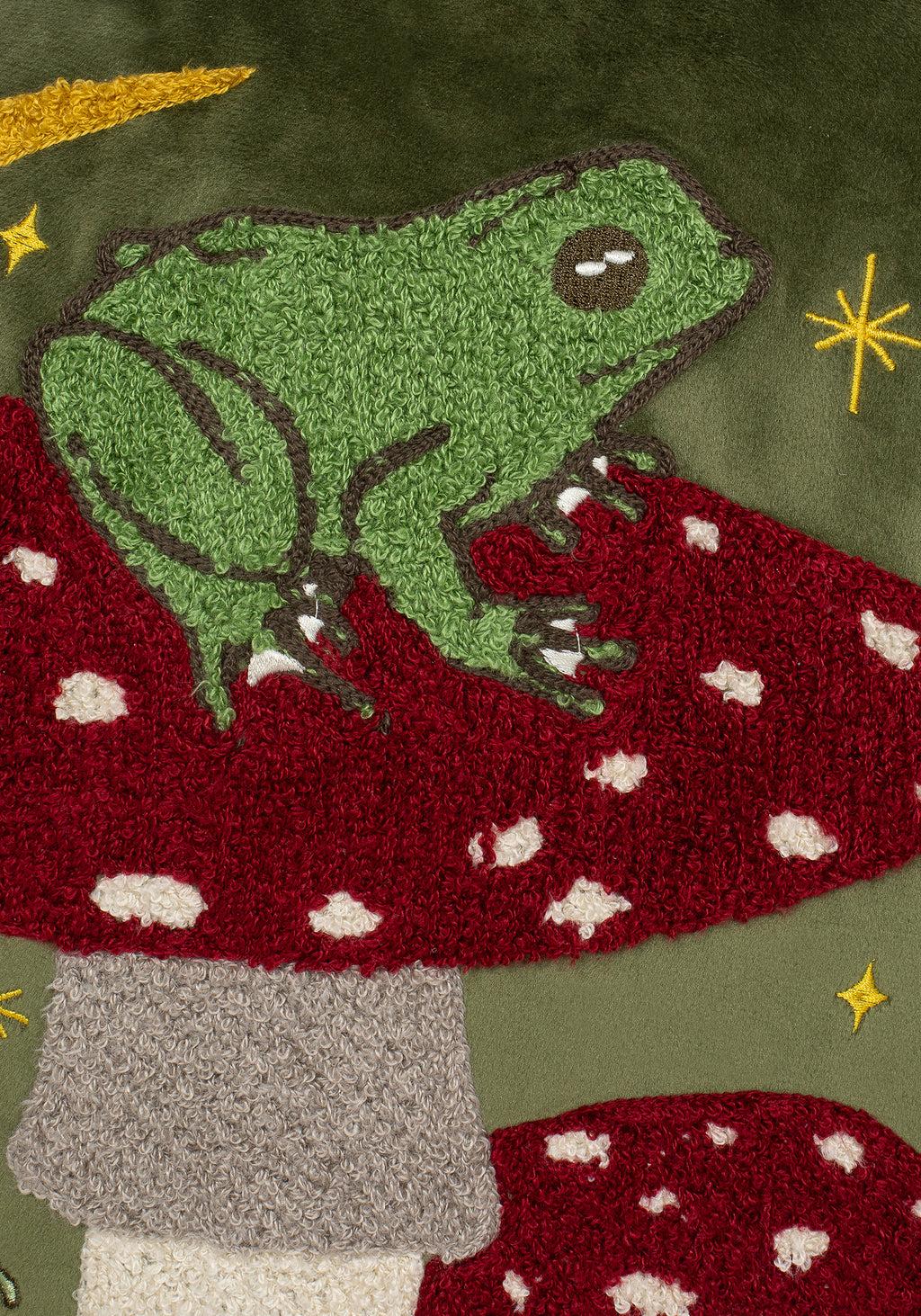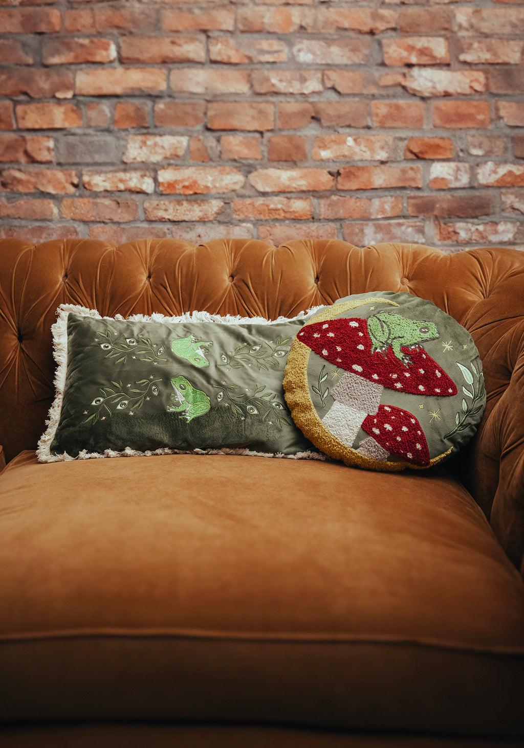 Don’t kiss a frog & hope for a prince - Green frog embroidered velour round cushion - Medium-sized round cushion for everyday decor - Soft green velour fabrication - Tufted frog, moon & mushroom embroidery on front - Insert included for instant use- Concealed zip for easy cleaning - We’re all about that swamp life 100% polyester