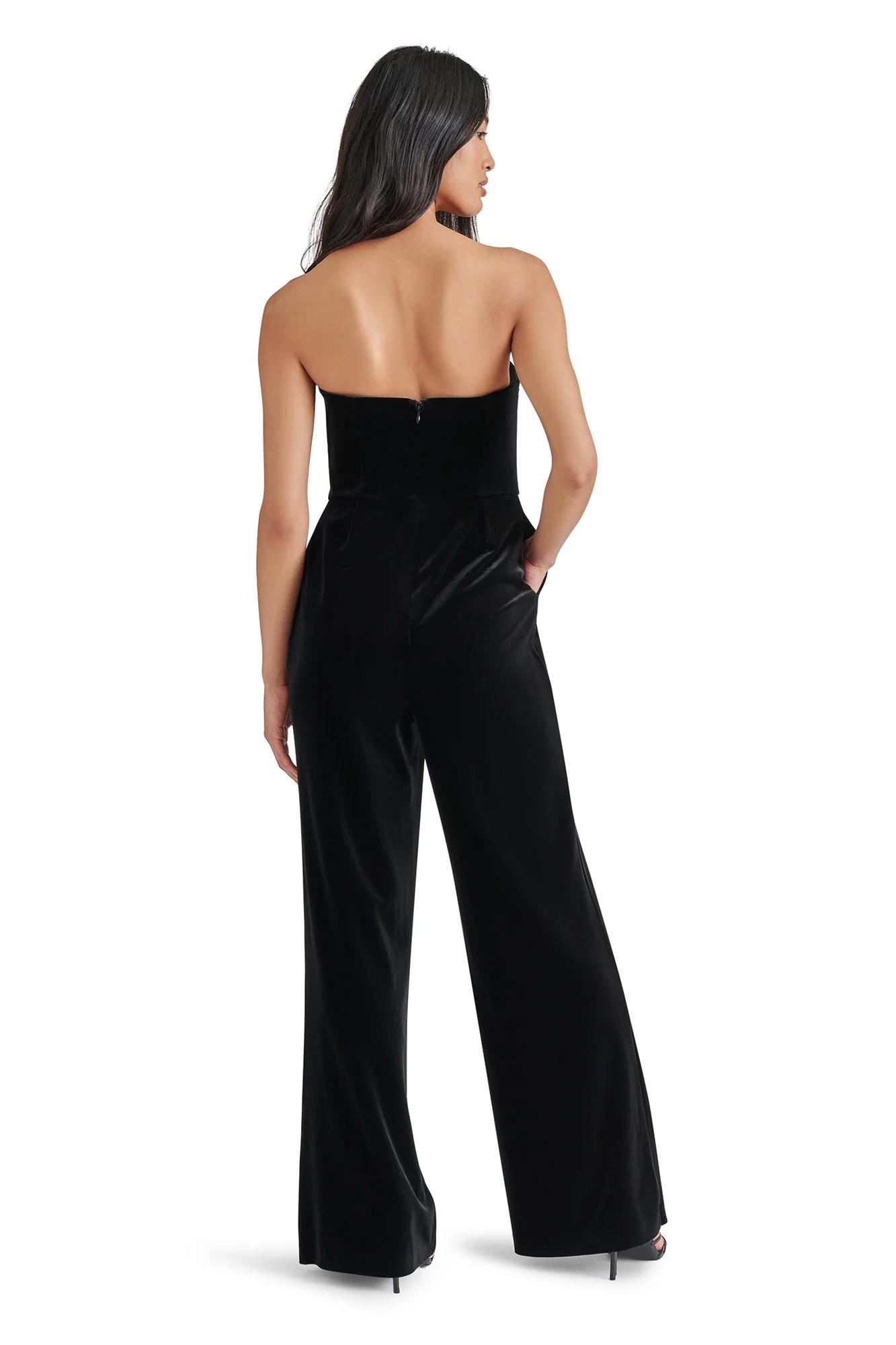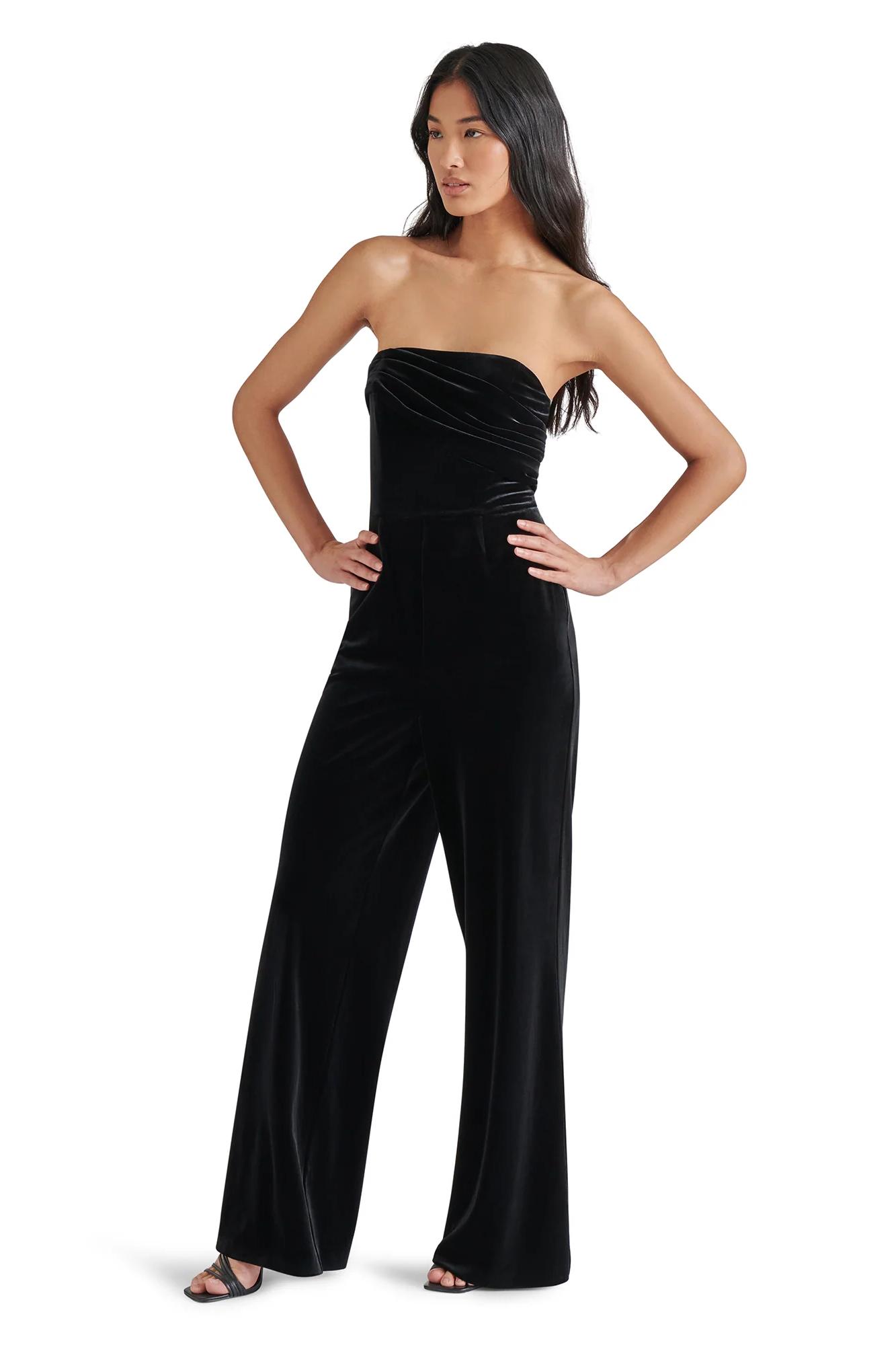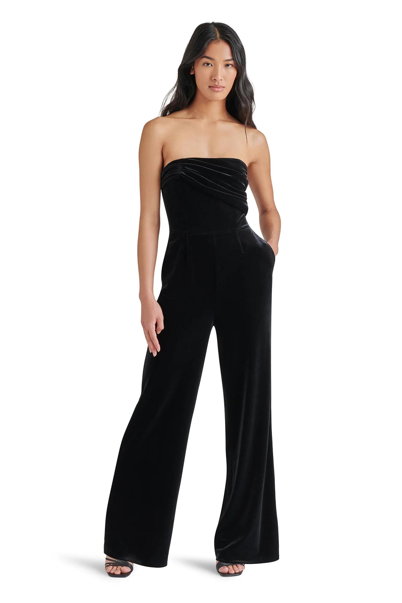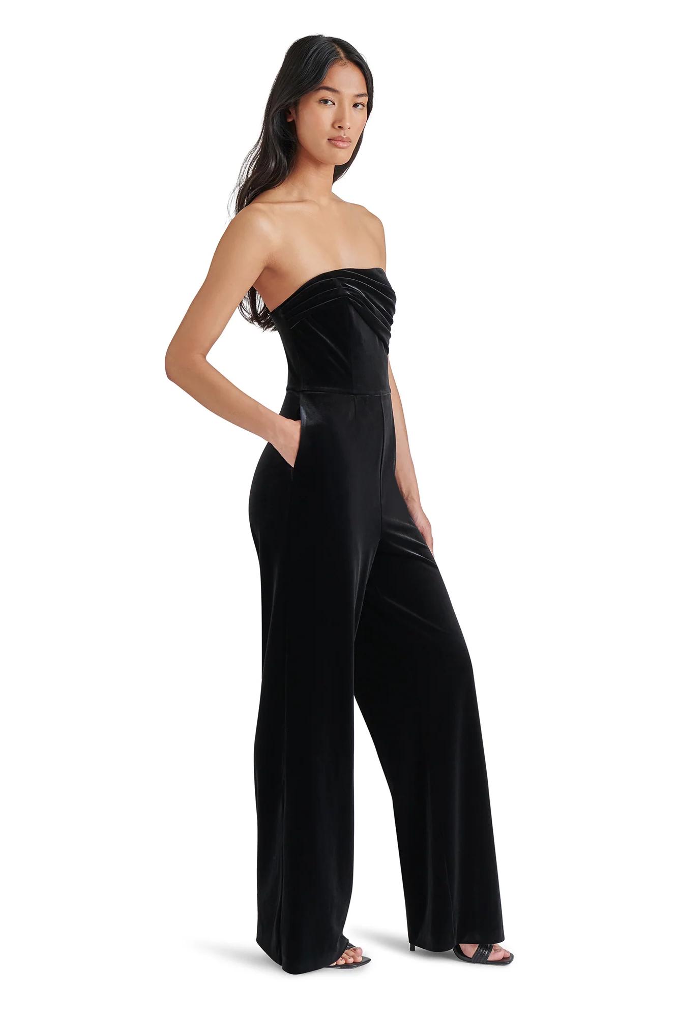 Strapless jumpsuit with draped detail at bodice, side pockets and wide-leg silhouette. Back zip closure and Lined