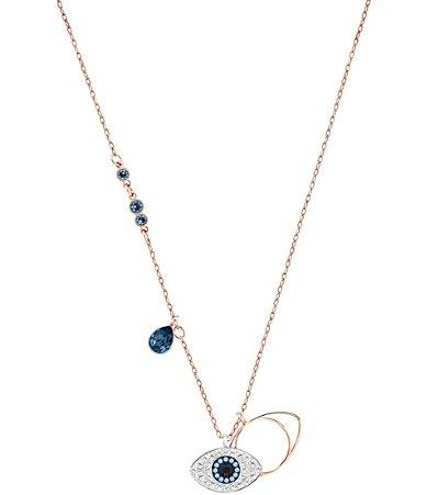 From Swarovski, this necklace features: The mixed-plated Duo Pendant Evil Eye adds a mystic touch to any look. It features one eye motif in blue, black, and clear crystal pave CZ and one in rose gold-plated metal. The pendant comes on a rose gold-plated chain embellished with dark blue crystals.Pendant necklaceLobster claw closureApprox. 14.875 x 0.75 x 0.5Imported.