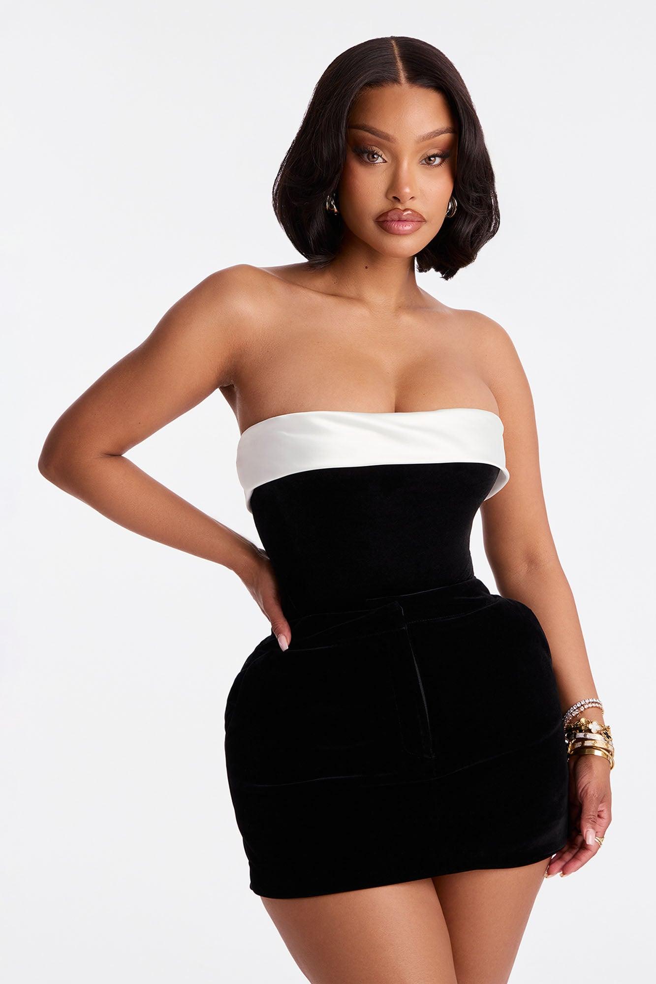 Available In Black/White, Green And Red. Velvet Bodysuit Strapless Straight Neckline Folder Over Detail Grip Tape Lined Thong Bottom Snap Button Closure Stretch Final Sale Self: 95% Polyester 5% Spandex Contrast: 95% Polyester 5% Spandex Imported