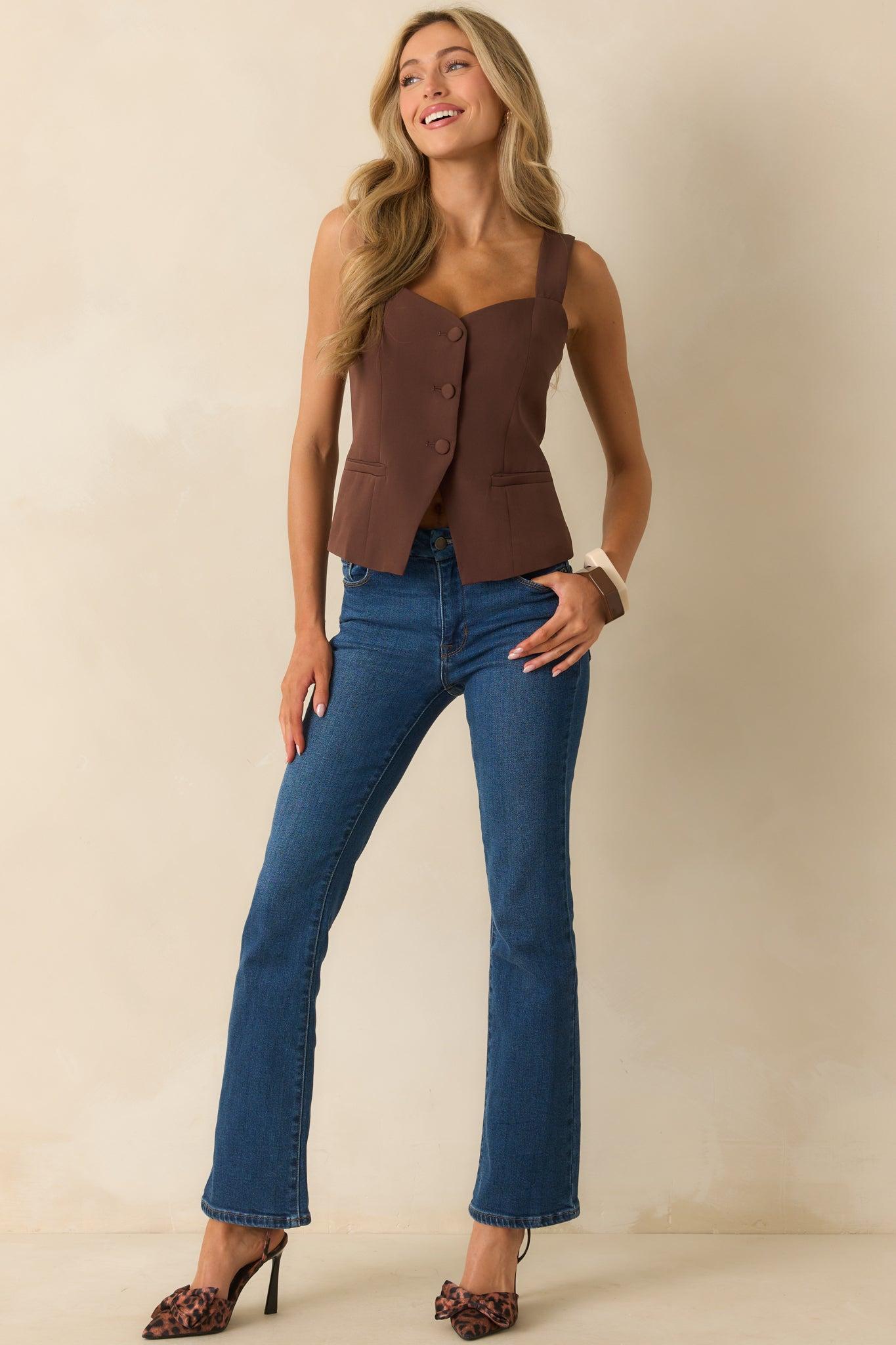 The Sweet And Certain Chocolate Brown Button Front Waistcoat Top blends softness with structure in the best way. It’s polished, pretty, and gives your look that little extra edge without overdoing it. This chocolate brown top features a waistcoat style design, sweetheart neckline, functional button front, faux front waist pockets, sleeveless wide straps, and a tailored fit. 96% Polyester & 4% Spandex Lined: 95% Polyester & 5% Spandex Hand Wash Cold Manufactured in China Designed in The USA Model is 5'8" and is Wearing a Size X-Small