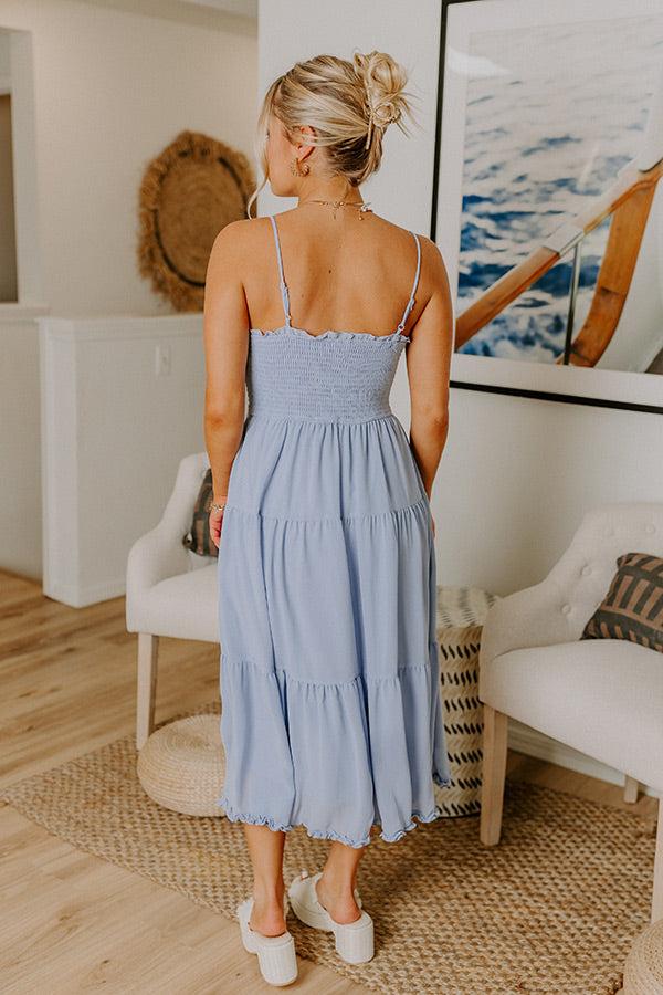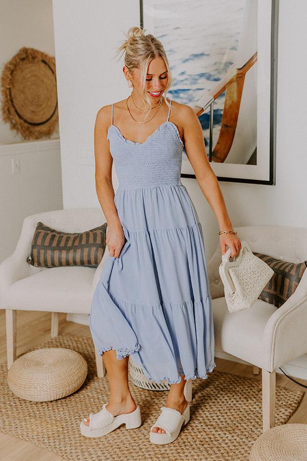 - Twirl through a charming moment in this darling midi! It features a flattering smocked bodice and frilled detailing that adds a sweet little touch. Every detail feels playful, polished, and ready to show off. - Flowy chiffon material - A scoop neckline with ruffle detailing - Adjustable spaghetti straps - A smocked bodice - An elastic neckline - A built-in skirt lining - A flowy and flattering silhouette that ends in a frilled, midi length hemline