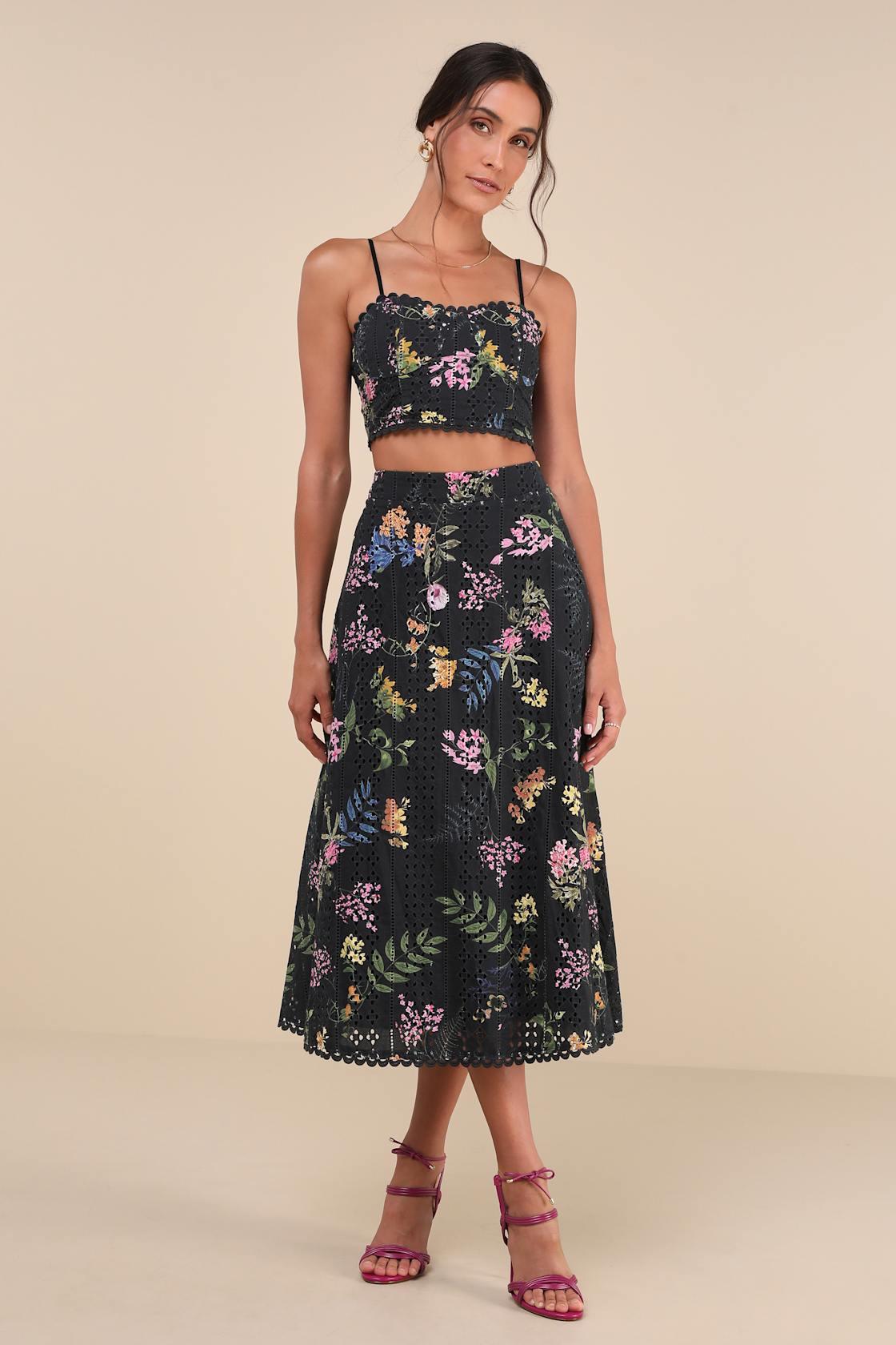The Lulus Sweet At Heart Black Floral Embroidered Two-Piece Midi Dress is tugging at our heartstrings! Lightweight woven fabric features a bright floral pattern and decorative eyelet embroidery throughout, shaping this sweet two-piece set. Adjustable spaghetti straps support a bustier-inspired bodice with scalloped lace trim at the neckline and hem, and a smocked panel at the back for fit. A high banded waist tops an A-line skirt that ends at a midi hem with matching scalloped lace trim. Hidden side zippers.