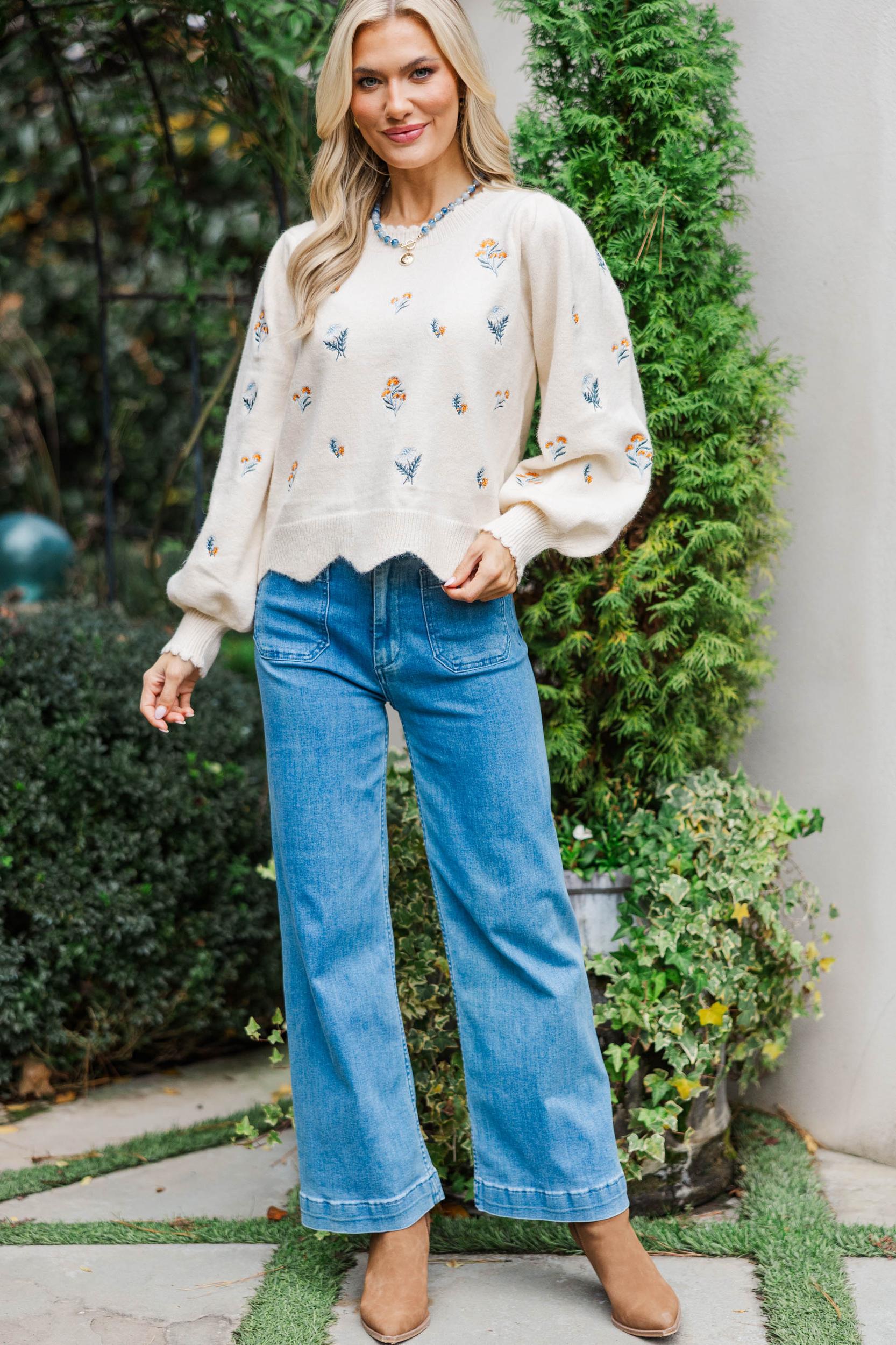 This charming sweater brings an elevated twist to an everyday essential. The soft neutral base is dotted with delicate floral embroidery, giving it a sweet, feminine feel while still being easy to style. It’s the perfect piece to dress up denim or pair with tailored bottoms for a polished, effortless look. Crew neckline Long balloon sleeves with ribbed cuffs Scalloped hemline Soft knit fabric Allover embroidered floral details Baileigh is wearing the small.