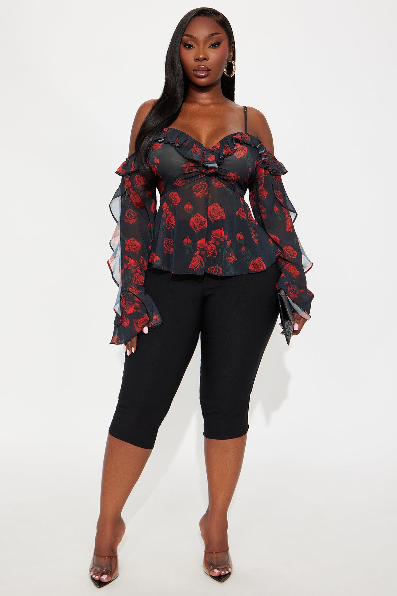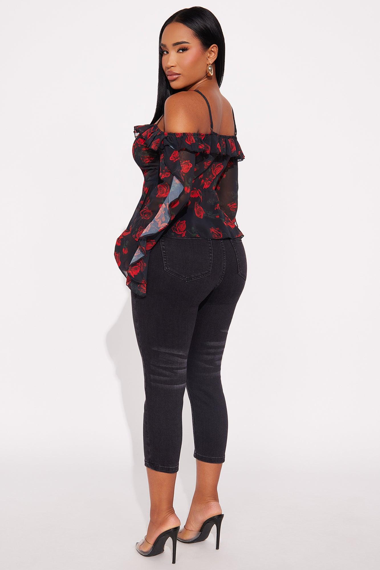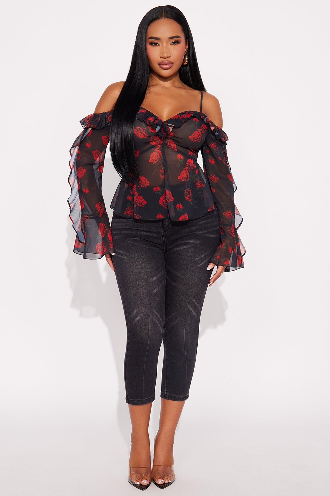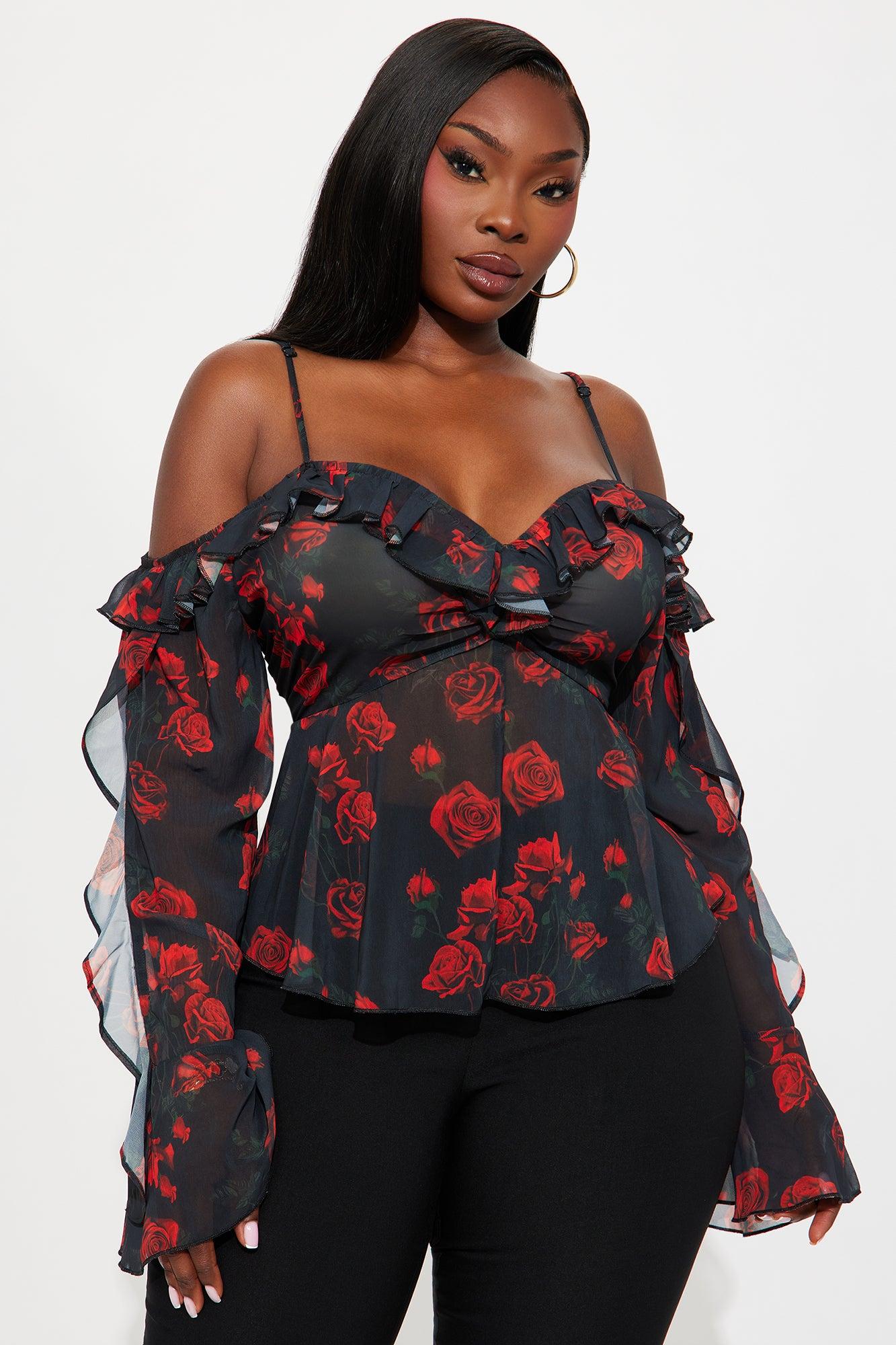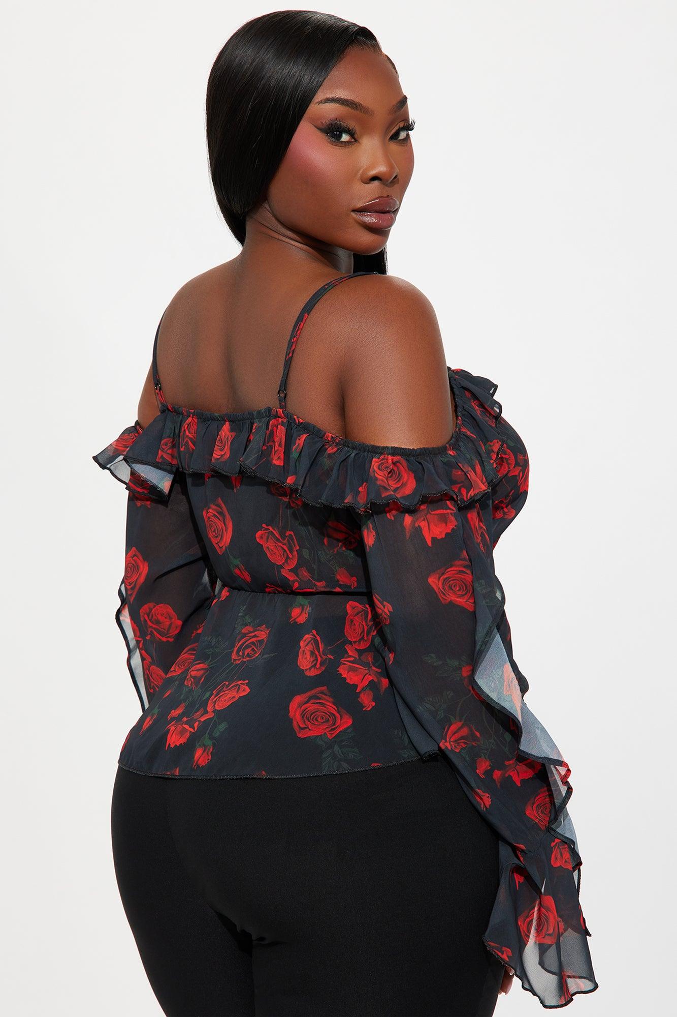 Sweet Delicate Rose Chiffon Ruffle Top - Black/Red Female