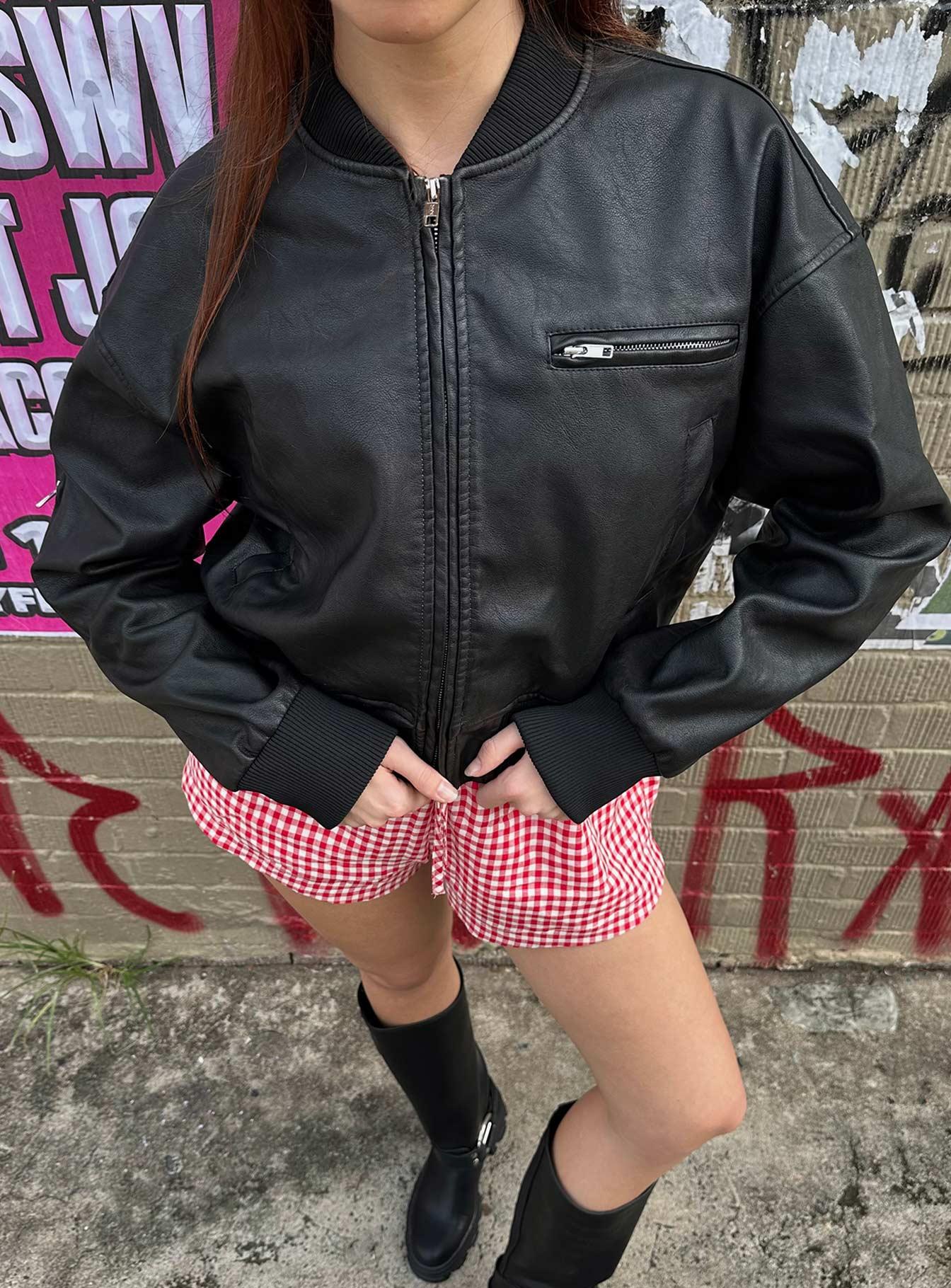 Sweet Disaster Faux Leather Cropped Bomber Jacket Black