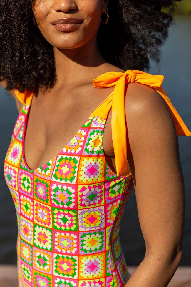 Details One Piece Swimsuit Fabric has stretch Adjustable tie straps, v-neckline Lined with padding Size small from shoulder to hem: 25" Material and Care Fabric: 82% polyester 18% elastane, lining: 95% polyester 5% elastane Machine wash cold, no drum drying Patterns may vary Materials may have natural variations Colors may vary from different viewing devices.