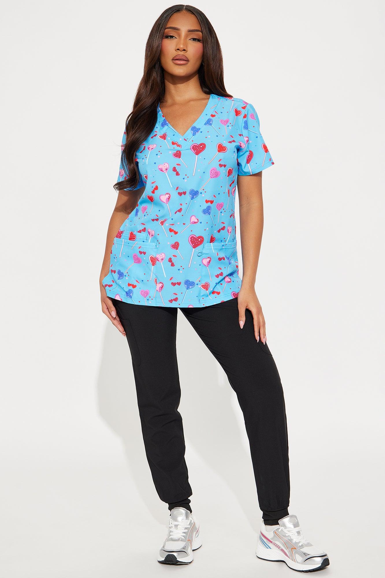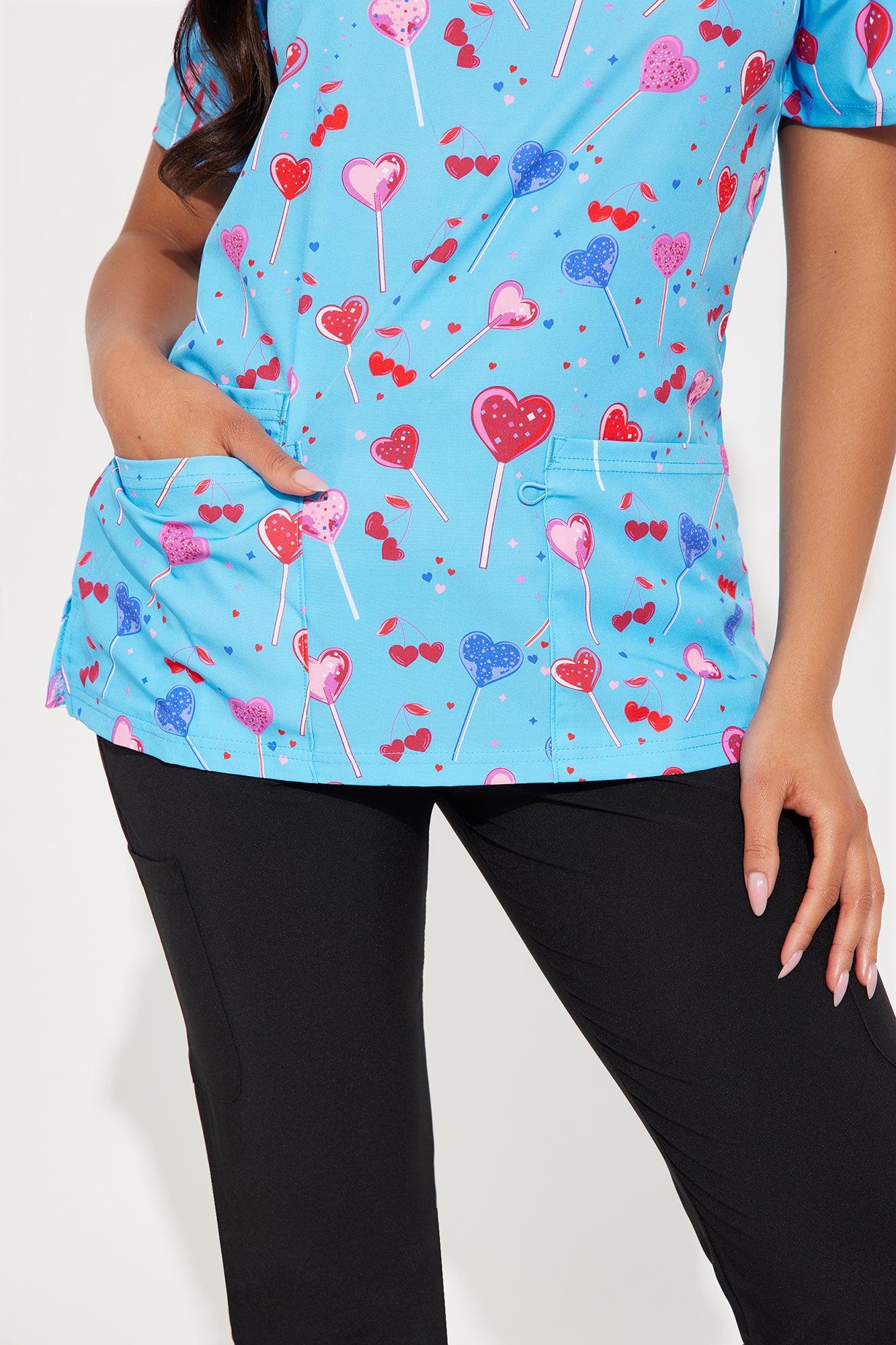 Available In Blue/combo. Uniform Scrub Top V Neck Short Sleeve Pockets Heart Lollipop Print Stretch 93% Polyester 7% Spandex Disclaimer: Print Placement Will Vary Imported California Proposition 65WARNING: Cancer and Reproductive Harm - www.P65Warnings.ca.gov.