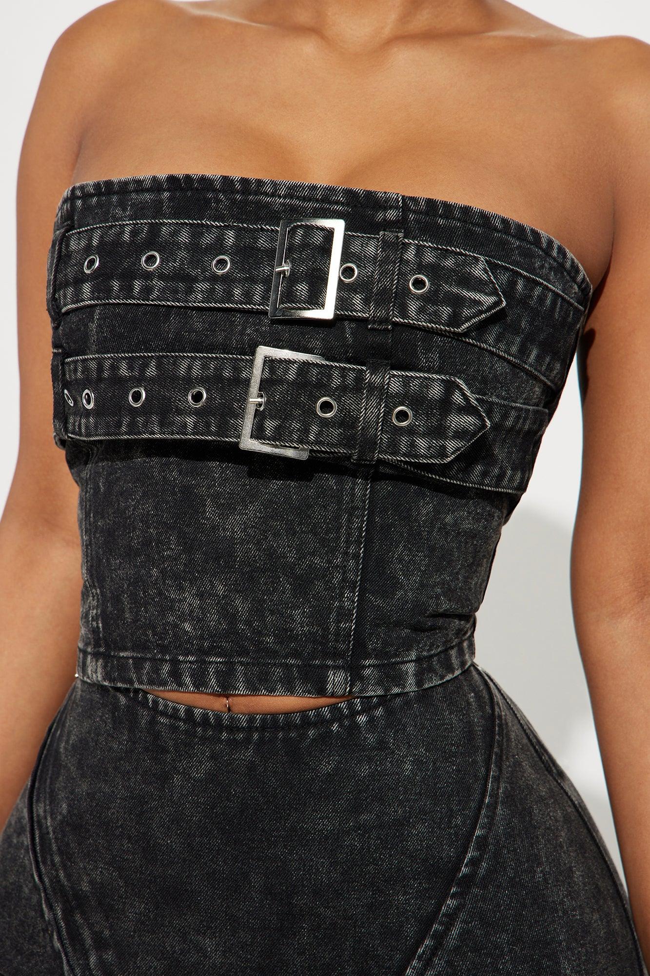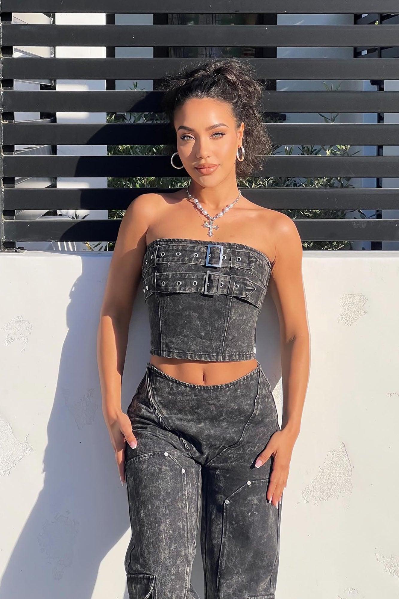 Available In Black. Mineral Wash Pant Set Tube Top Strapless Belt Detail Back Metal Zipper Cropped Wide Leg Partial Elastic Waistband Hidden Front Zipper Cargo Pockets Ankle Button Detail Non Stretch Inseam: 31.5" 80% Cotton 20% Polyester California Proposition 65WARNING: Cancer and Reproductive Harm - www.P65Warnings.ca.gov.