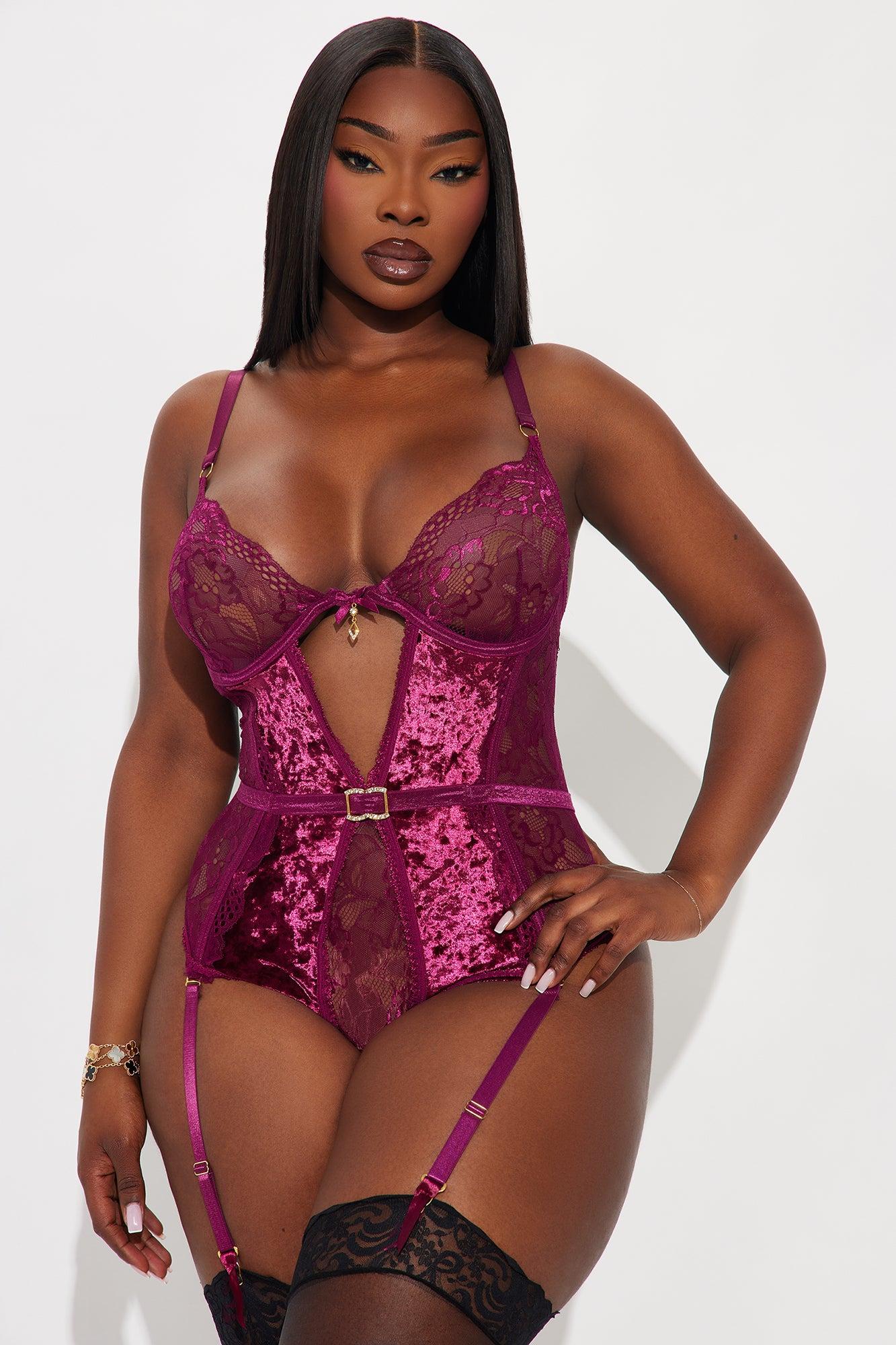 Available In Green And Wine. Velvet Lace Teddy Adjustable Straps Unlined Underwire Bow Detail, Charm Detail Cut Out Detail Hook And Eye Closure Lace Panels Waist Belt Detail Removable Garter Straps Thong Bottom 92% Polyester 8% Elastane Final Sale Imported