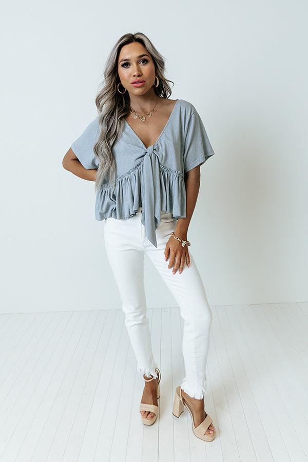 We have no doubt this flirty airy blue top will look so sweet on you with its lightweight material, a v-cut neckline with a front tie detail, short sleeves, and a cute peplum silhouette that ends in an uneven hemline! on products Measurements S : Bust 44", Hip 42", Length 19", Sleeve Length 7.5", Waist 42". M : Bust 46", Hip 44", Length 19.5", Sleeve Length 8", Waist 44". L : Bust 48", Hip 46", Length 20", Sleeve Length 8", Waist 46". XL : Bust 50", Hip 48", Length 20.5", Sleeve Length 8.5", Waist 48".