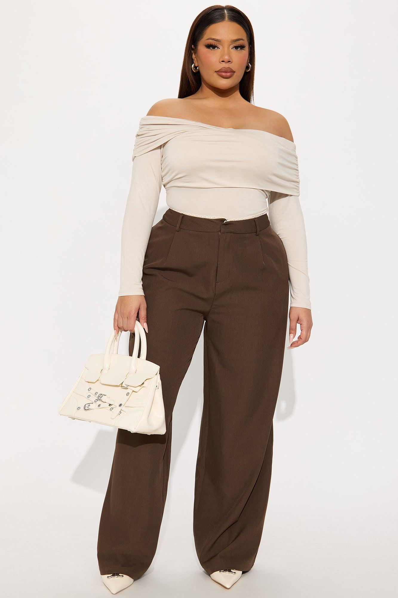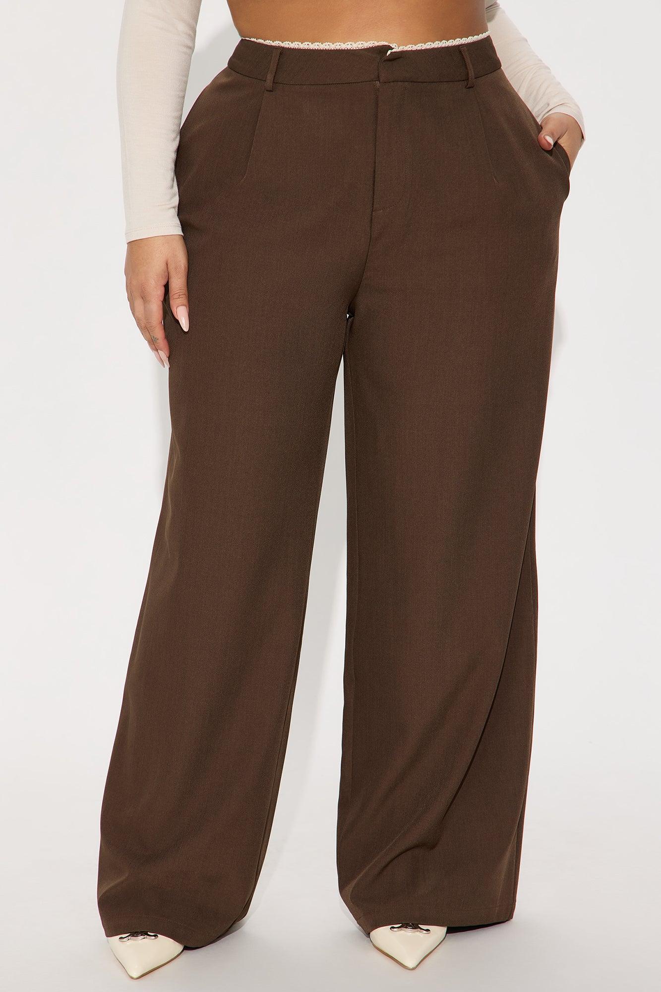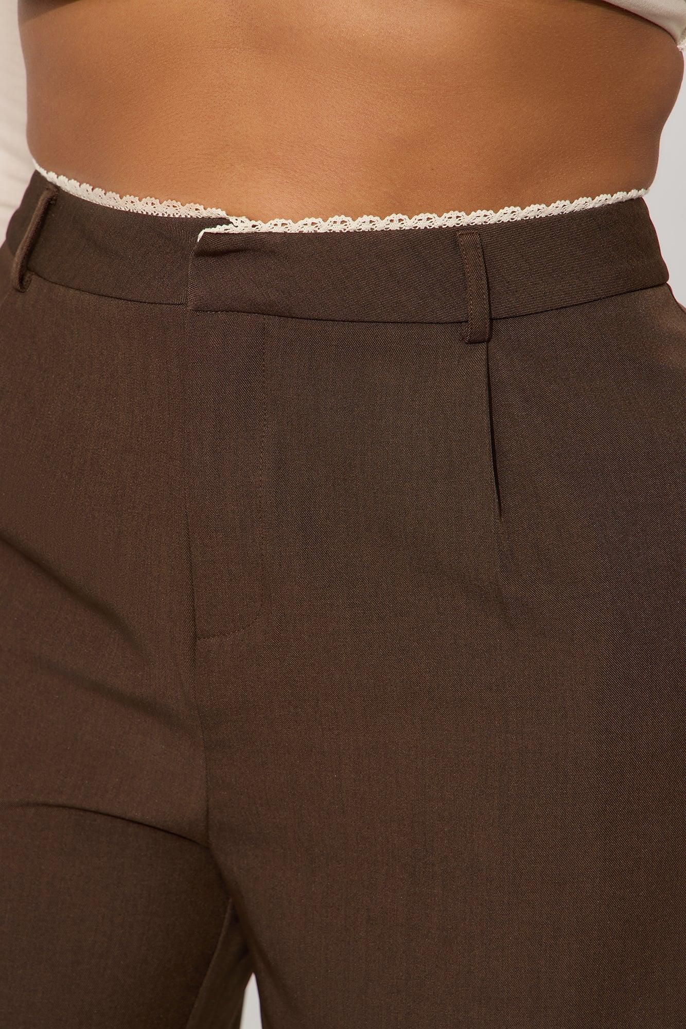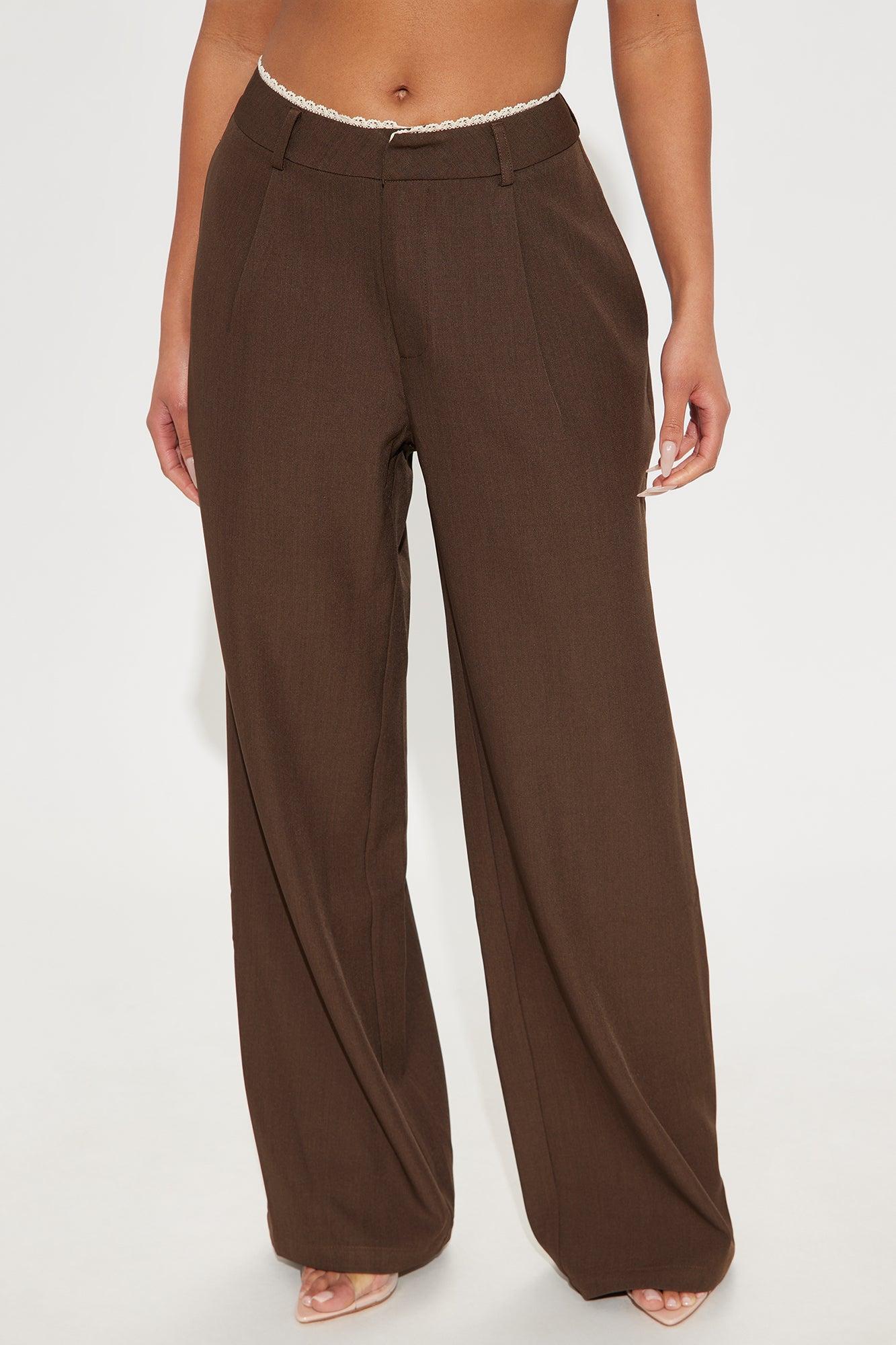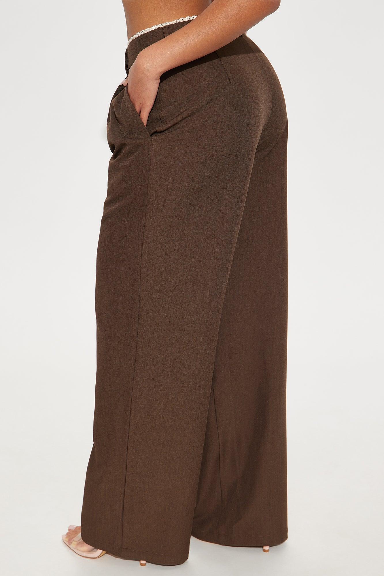 Available In Brown And Khaki. Wide Leg Trouser Mid Rise Lace Trim Waistband Hook & Eye Closure Hand Pockets Pleated Front Non Stretch 32" Inseam Self: 97% Polyester 3% Spandex Imported California Proposition 65 WARNING: Cancer and Reproductive Harm - www.P65Warnings.ca.gov.