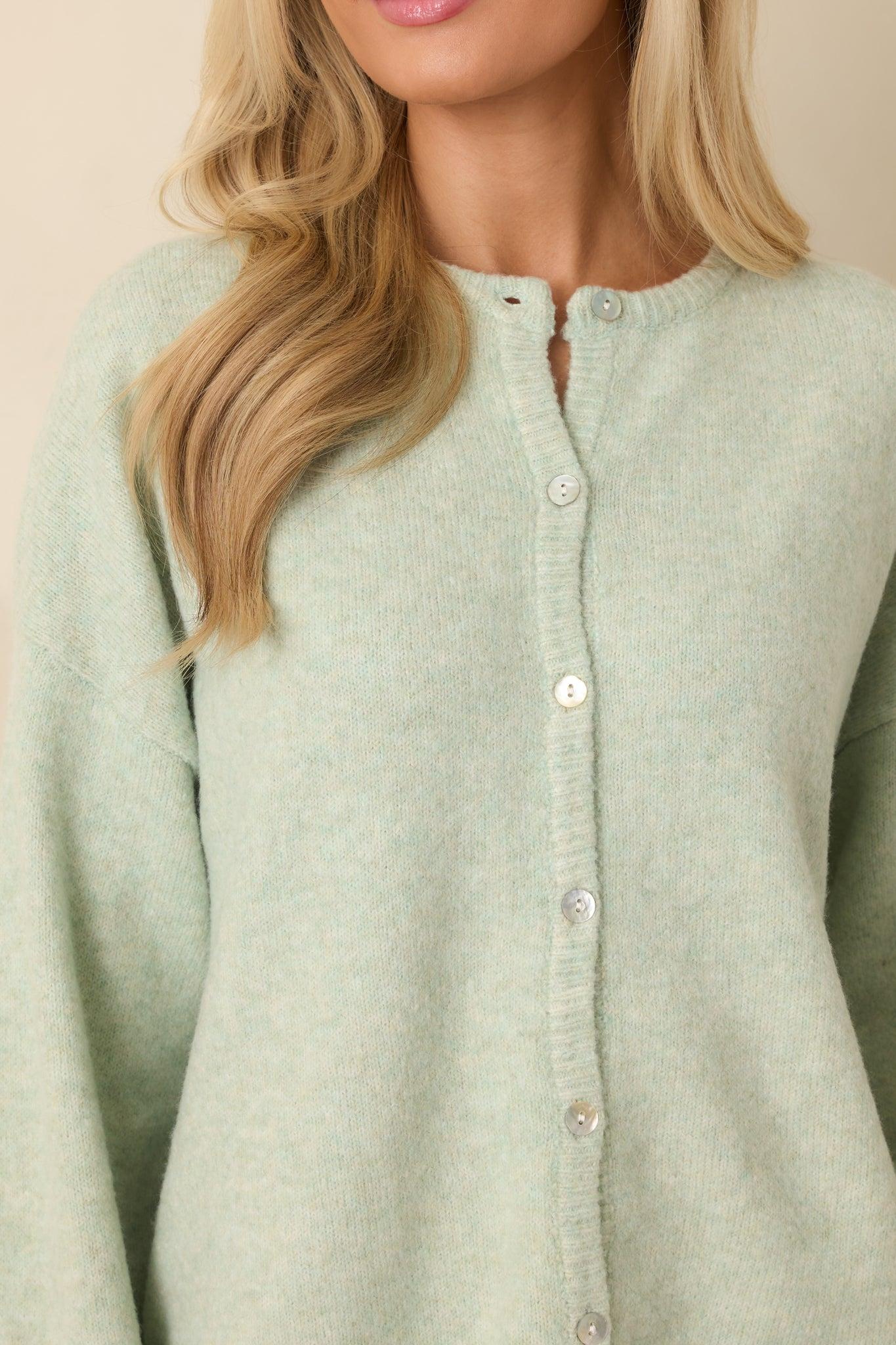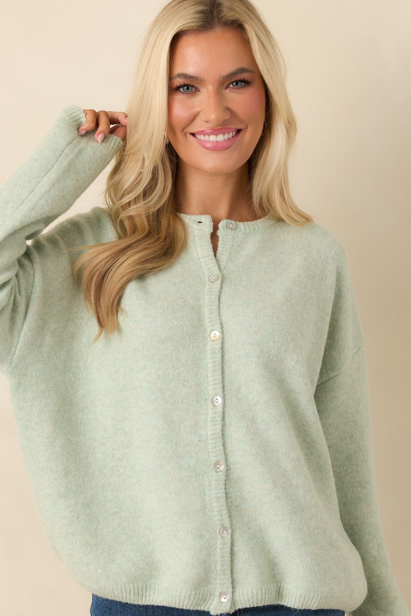 Sweet Simplicity Mint Green Knit Button Front Cardigan is all about easy charm and everyday comfort. This mint green cardigan brings a soft pop of color with a cozy knit feel that layers effortlessly over anything. It’s the kind of piece that feels calm, pretty, and naturally put-together — perfect for slow mornings, casual plans, and everything in between. This mint green cardigan features a soft knit fabrication with a button-front closure and round neckline. Designed with long sleeves and a relaxed fit, it’s finished with ribbed trim at the neckline, cuffs, and hem for a classic, clean look.50% Recycled Polyester, 47% Polyester, & 3% Spandex Unlined Hand Wash Cold Manufactured in China Designed in The USAModel is 5'6" and Wearing a Size X-Small
