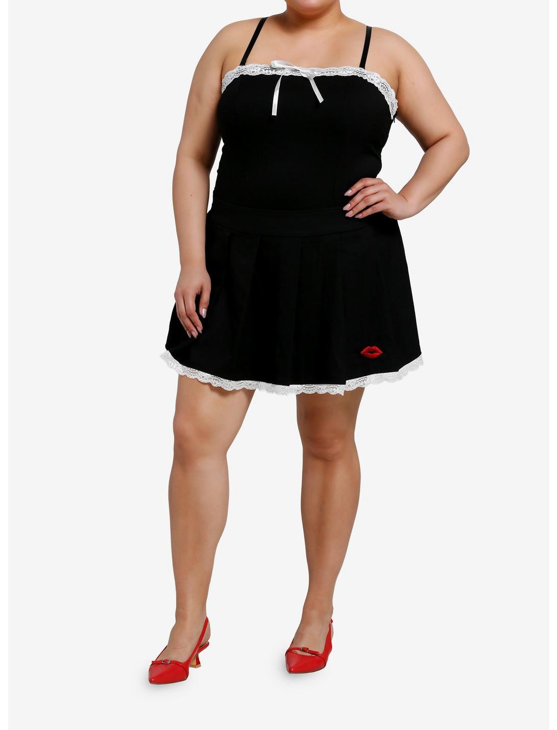 Feel flirty and sassy with a cute little black dress! Featuring a pleated skirt with red lips embroidered at the hem. Designed with lace trim and a dainty bow at the neckline. Comes with adjustable straps and smocking on the back.Please note: Style is fitted with no stretch; size up for a looser fit.90% nylon; 10% spandexWash cold; dry lowNon-stretch materialLength: 30''ImportedModel is 5'10''Model wears size 1
