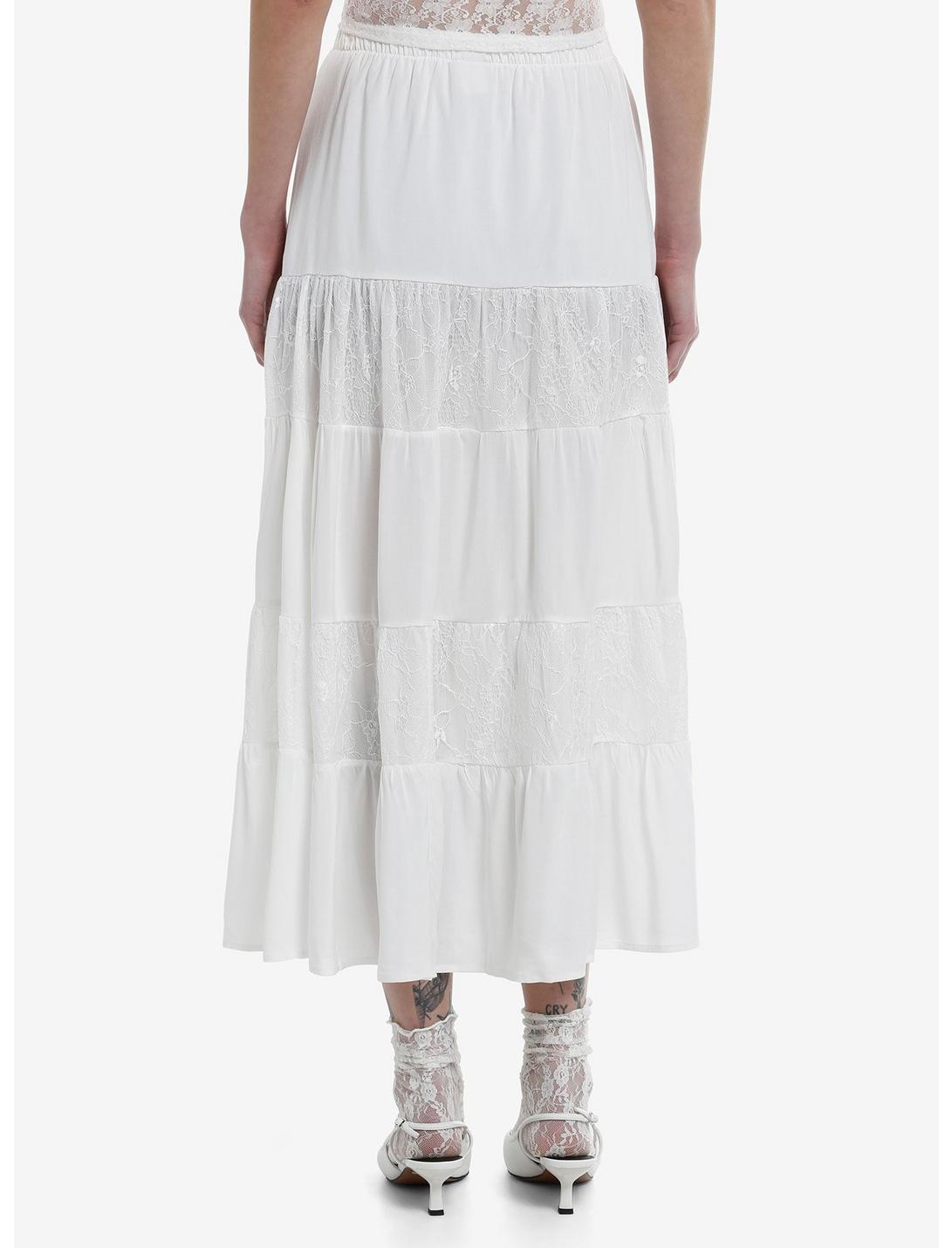 Channel some Y2K style with this white maxi skirt! It is tiered with alternating white lace panels. Comes with an elasticated waistband.90% rayon; 10% spandexWash cold; dry lowLength: 36''ImportedListed in junior sizesModel is 5'10''Model wears size Small