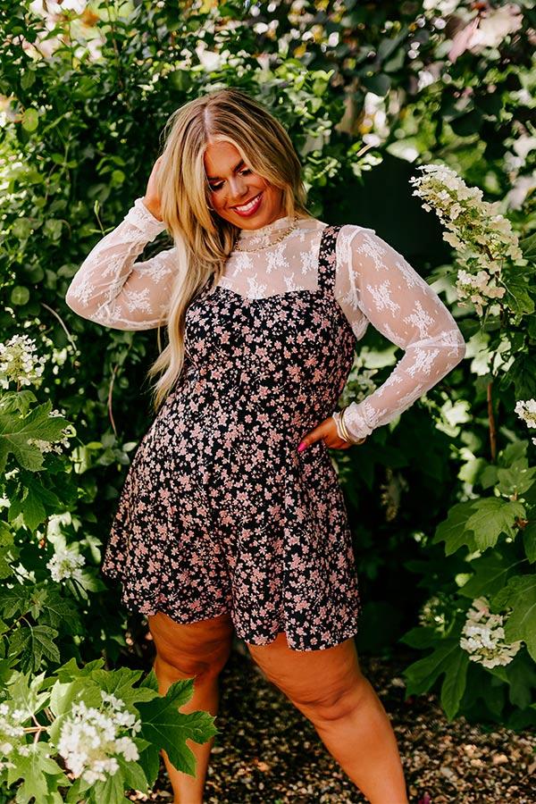 - This sweet romper is perfect for a stylish casual outing or a walk down the beach! - Unlined stretchy material with a floral design - A scoop neckline - 1.5 inch wide shoulder straps - An elastic back detail - A figure flattering romper silhouette that ends in straight upper-thigh length hemlines