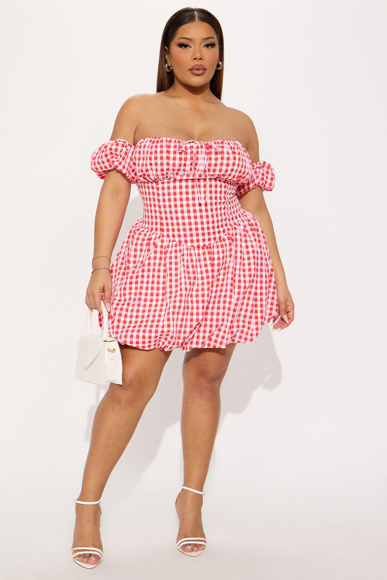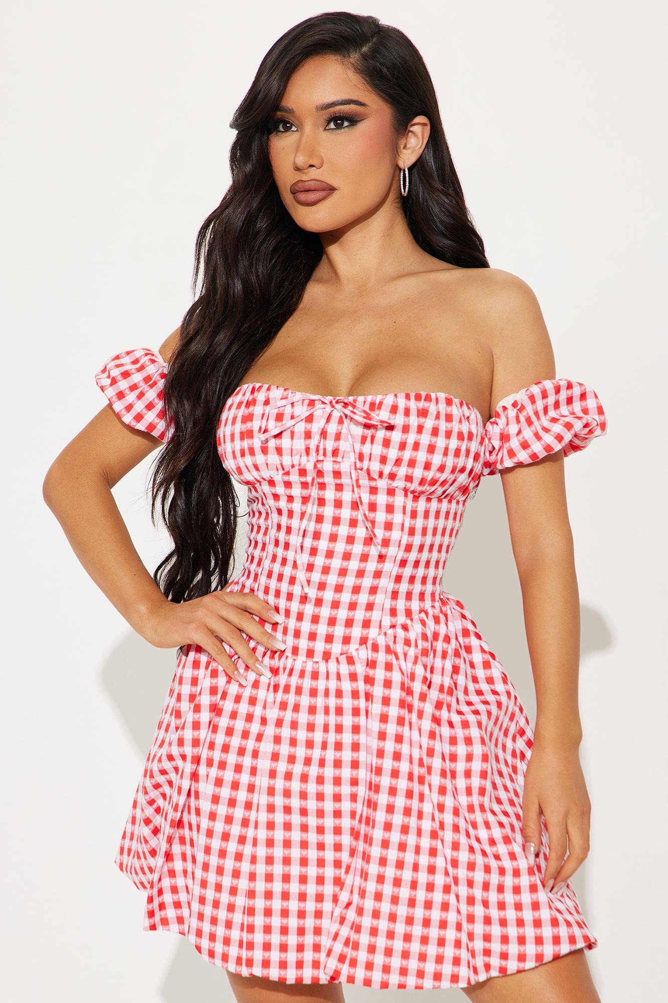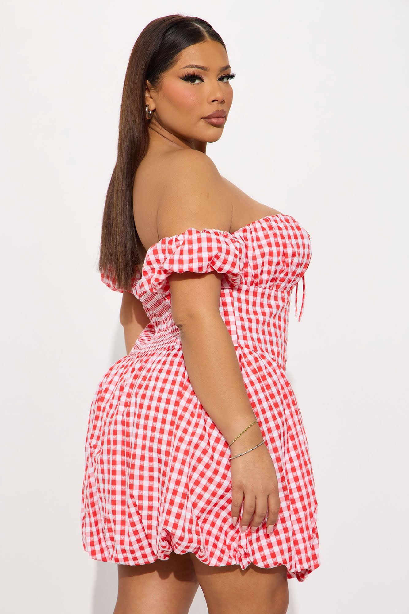Available In Red. Gingham Bubble Mini Dress Off shoulder Short sleeves Tie front Faux corset waist Bubble hem Smocked back Length measured flat = 25" Self: 50% Polyester 50% Cotton Lining: 100% Cotton Imported