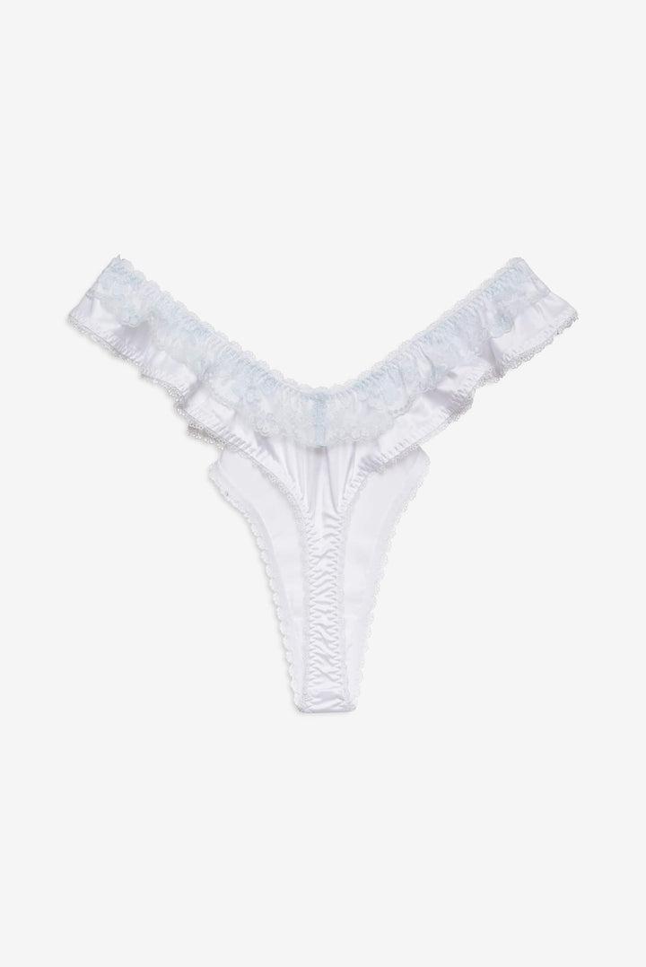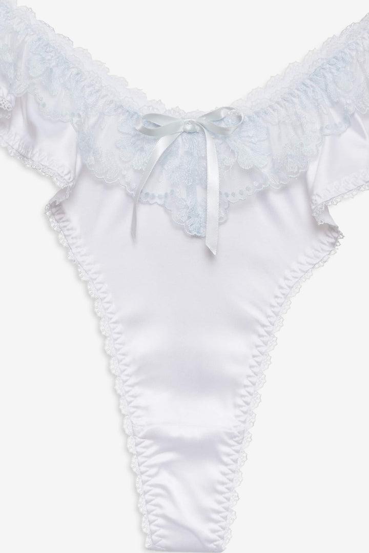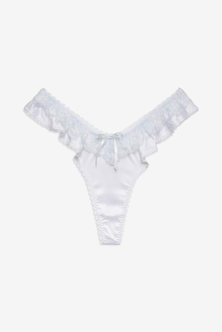 Blurring the lines between lingerie and daywear, the Sweetheart ruffle thong panty was made for lounging. This white panty is crafted in a sleek satin and adorned with vintage-inspired lace trims and a decorative satin bow.