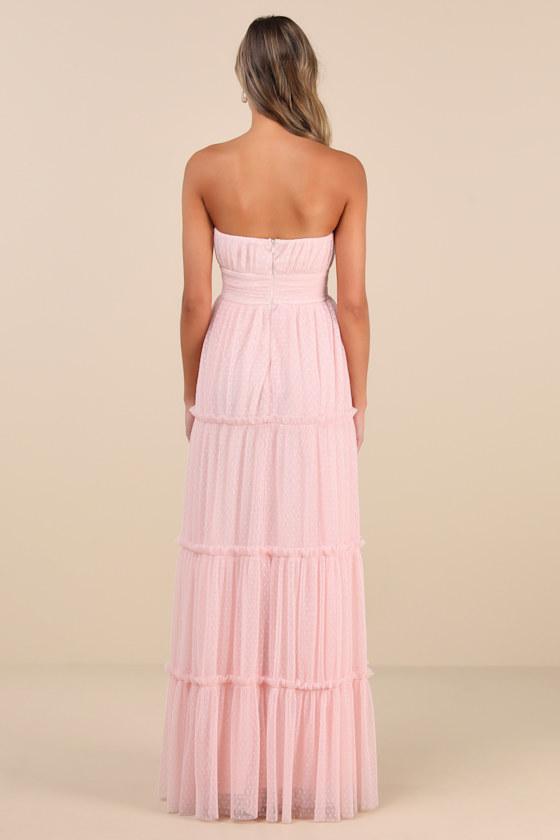 We're all about a look that is easy to style and even easier to feel confident in, which is why the Lulus Sweetness Light Pink Mesh Swiss Dot Tiered Maxi Dress is a must-have! This tulle-mesh, Swiss dot-adorned dress starts with a strapless bodice that features a straight neckline and a lightly gathered bust. A fitted waist tops a flowy, A-line maxi skirt, accented with ruffle-trimmed tiers throughout. Hidden no-slip strips and hidden back zipper/clasp.