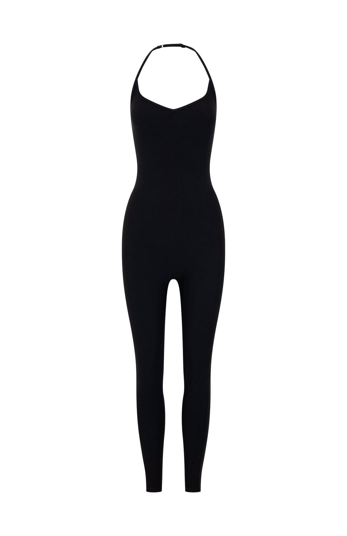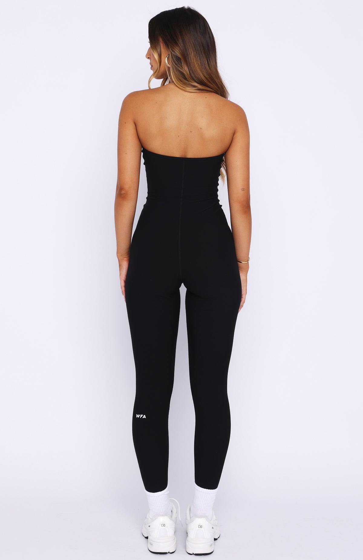 WHITE FOX ACTIVE Stretch, strengthen and slay in the Swift Jumpsuit Black. Crafted in high stretch fabrication this jumpsuit features fixed halter with an adjustable strap, a flattering scoop neckline with a subtle V-curve, and internal under-bust elastic for gentle support. The fitted silhouette hugs curves, while the open back adds a bold edge. Style with socks and sneakers for a sleek, gym-ready look.