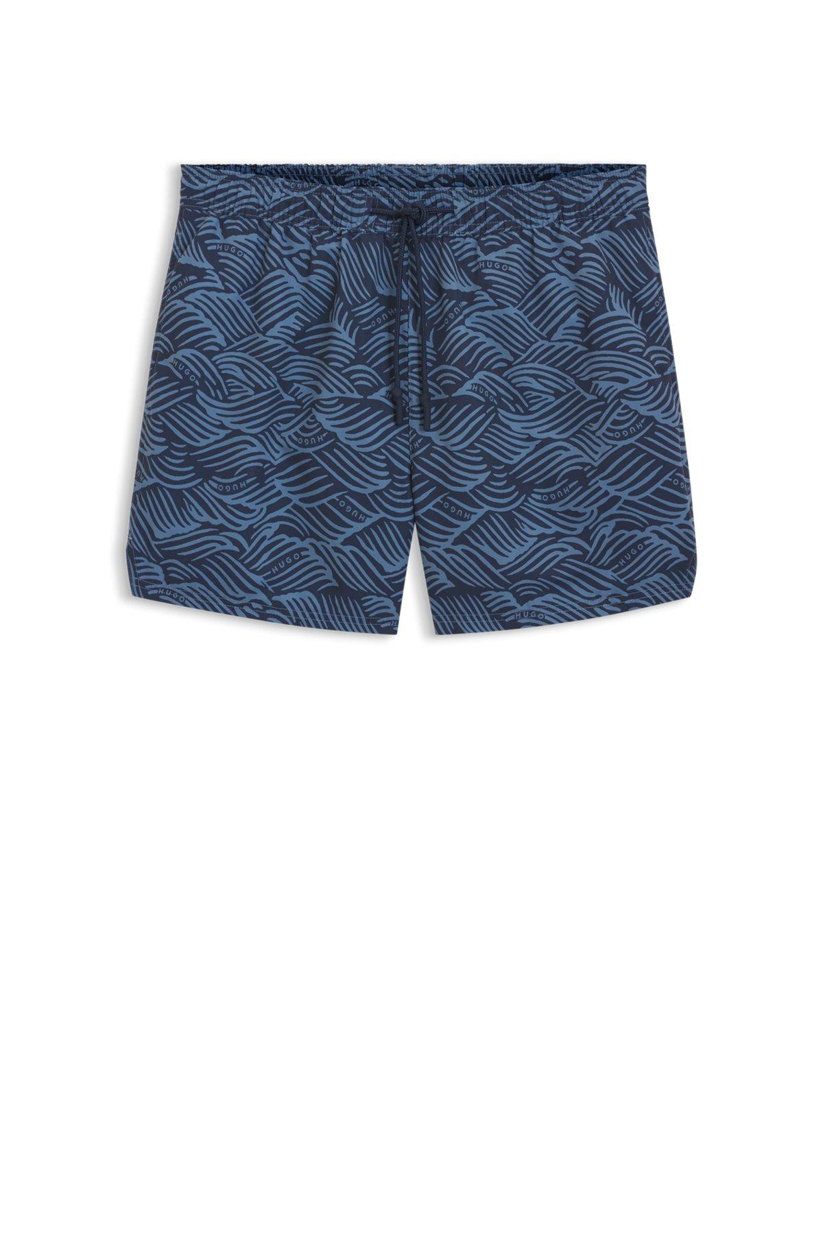 Refresh your collection with the modern artwork of these HUGO Menswear swim shorts. Incorporated HUGO logos. Naturally quick to dry.