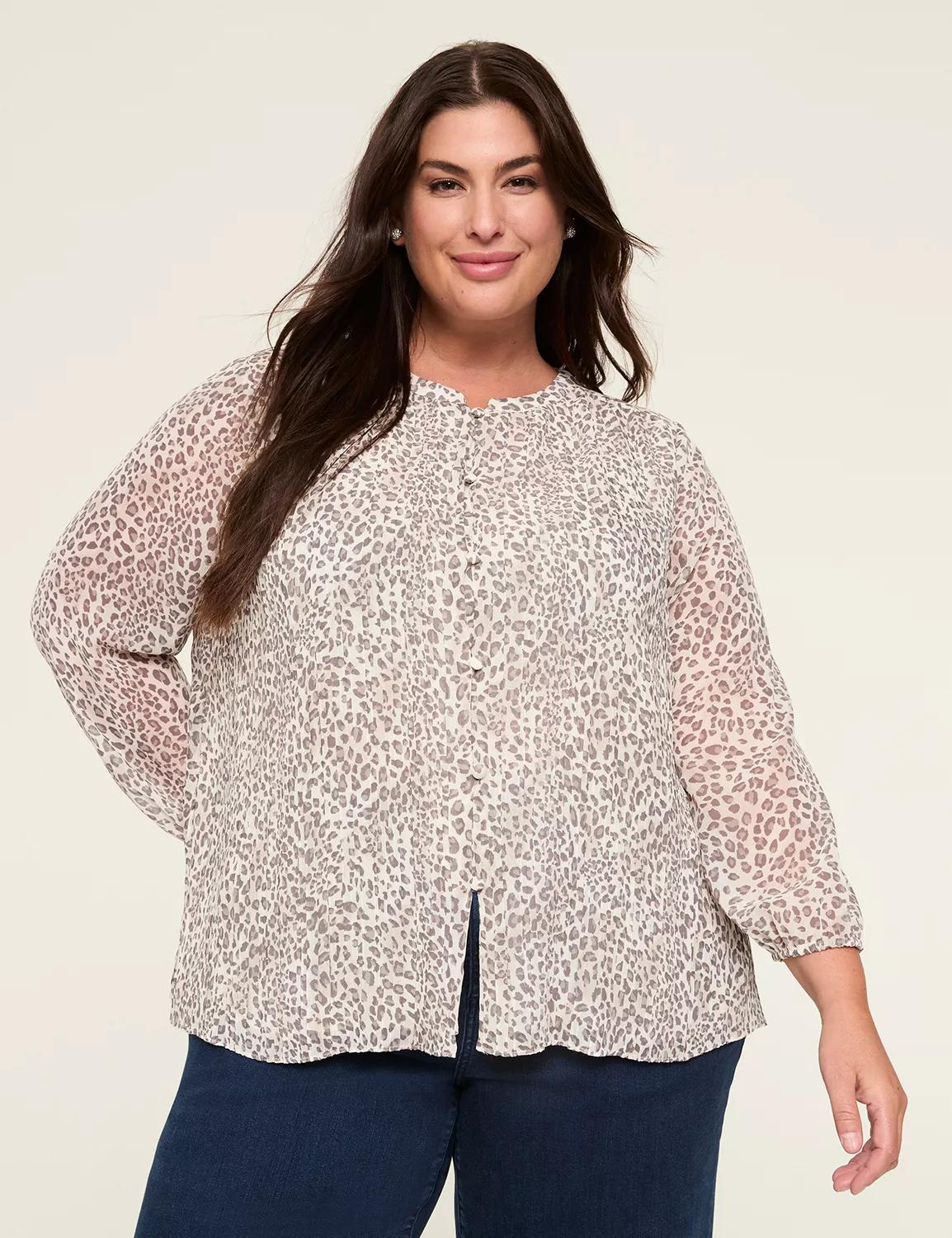 Available in Plus Size Our fan-fave, made-for-curves Swing fit. Lush, feminine pleats. Oh-so-breathable fabric. Three reasons your closet needs this button-front blouse. FIT: SWING. Our just-right full swing perfectly flatters your curves. Front Body Length From Shoulder: 29.75 (On Size 18) Standard length FEATURES: Split neck Bracelet length sleeves with elastic cuffs Lined Button front Pleated front FABRIC: Breathable woven fabric Machine Wash 100% Polyester Item Number #409632 Imported Plus