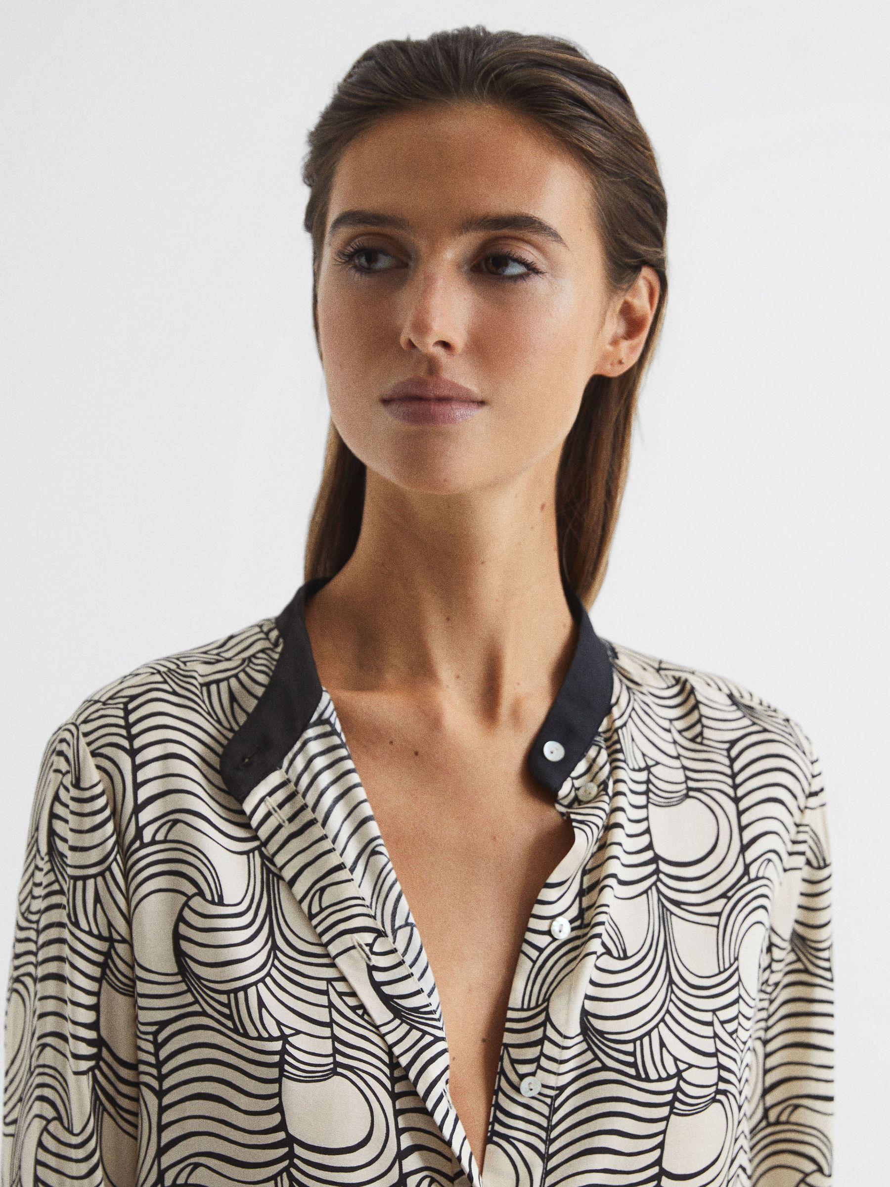 The Jess shirt is crafted in a nuanced swirl print that adds depth to the wardrobe. It s made from a soft and smooth satin-feel fabrication that s naturally fluid. Wear it with trousers and heels for a classic look. Button front closure. Long sleeves. Buttoned cuffs. Scarf print. Relaxed fit. The model is wearing a size 8. Measurements of model: Height 5ft 10" / 178cm.