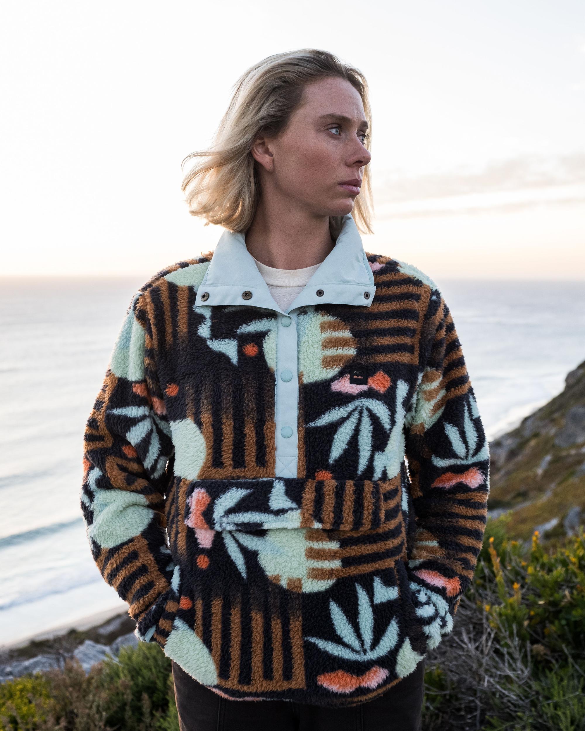 Discover the perfect blend of comfort and style with Billabong's Switchback Mock Neck Fleece. This pullover features a partially recycled polyester fabric, designed in a relaxed fit, with a mock neck, and snap front closure. A perfect piece to accompany your adventures in the great outdoors. Featured here in the Black Multi colorway.Features Collection: Adventure Division collection. Fabric: Partially recycled polyester soft cosy partially recycled sherpa blend shell fabric. Fit: Relaxed fit. Neck: Mock neck. Length: 26" hps (Size M). Closure: Snap front closure at neck. Pocket: Top entry hook and loop tape closure pocket. Side entry waist pockets. Hem finish: Elastic binding at hem and sleeve. Lining: Collar lined with partially recycled ripstop fabric. Branding: Moulded Rubber ADVENTURE DIVISION exterior label. Sizing: This product follows junior sizing, check the size chart for your perfect fit.
