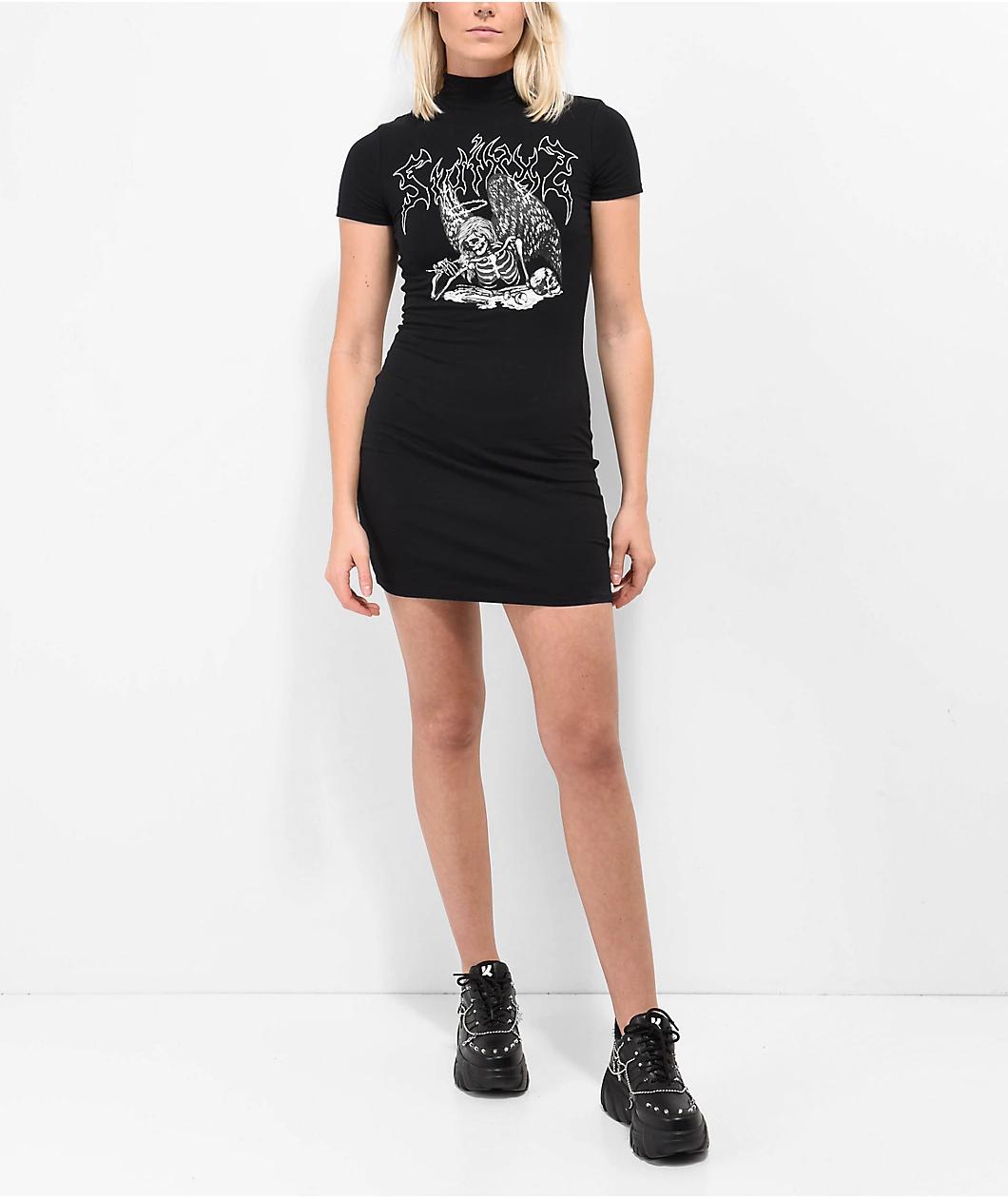 The Best Wishes buckle dress from SWIXXZ is made of a cotton-spandex blend and comes in a black colorway with a screen-printed graphic on the front boasting brand script and a skeletal angel holding a rose. This dress features an exposed back with three r