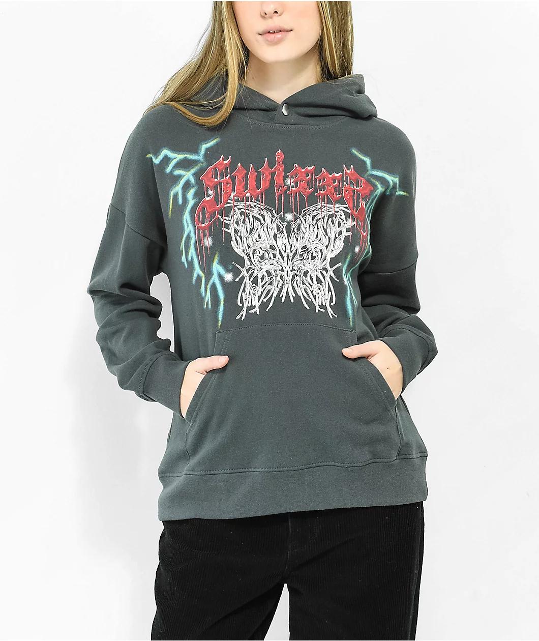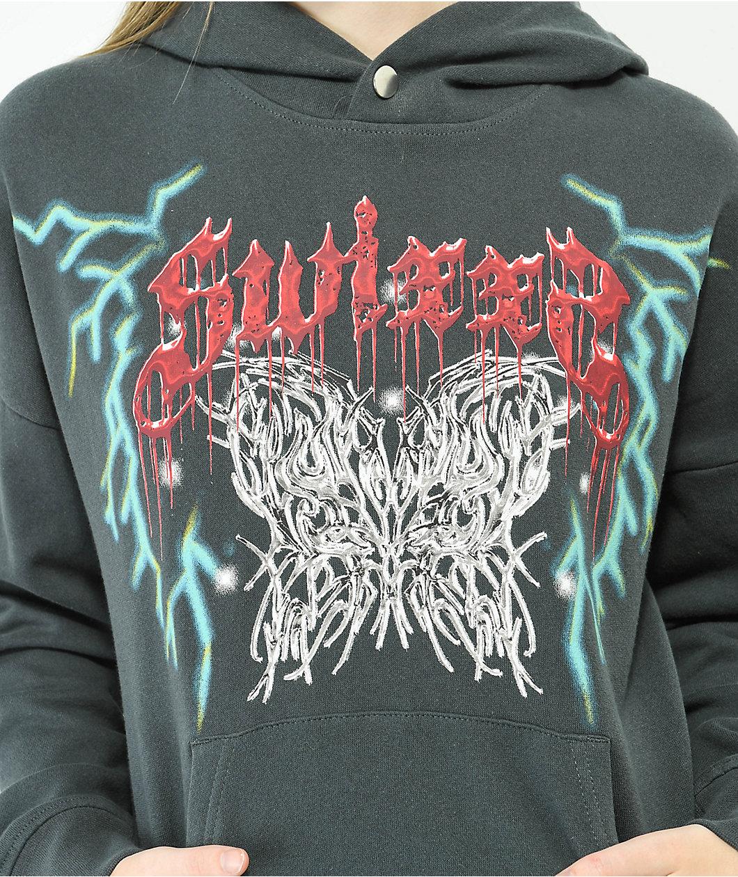 The Butterfly Chrome hoodie from SWIXXZ is made of a cotton-poly blend and comes in a grey colorway with a screen-printed front graphic of the brand name and a chrome butterfly. This comfy hoodie has a loose fit with a kangaroo pouch pocket so you can kee