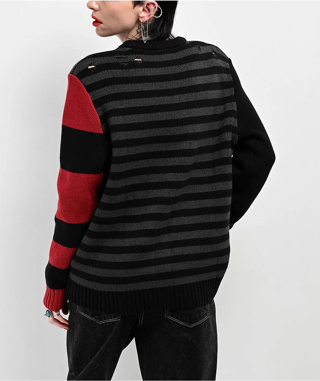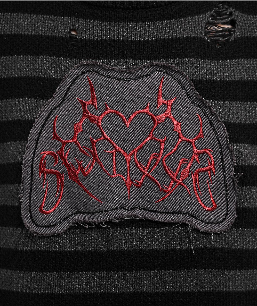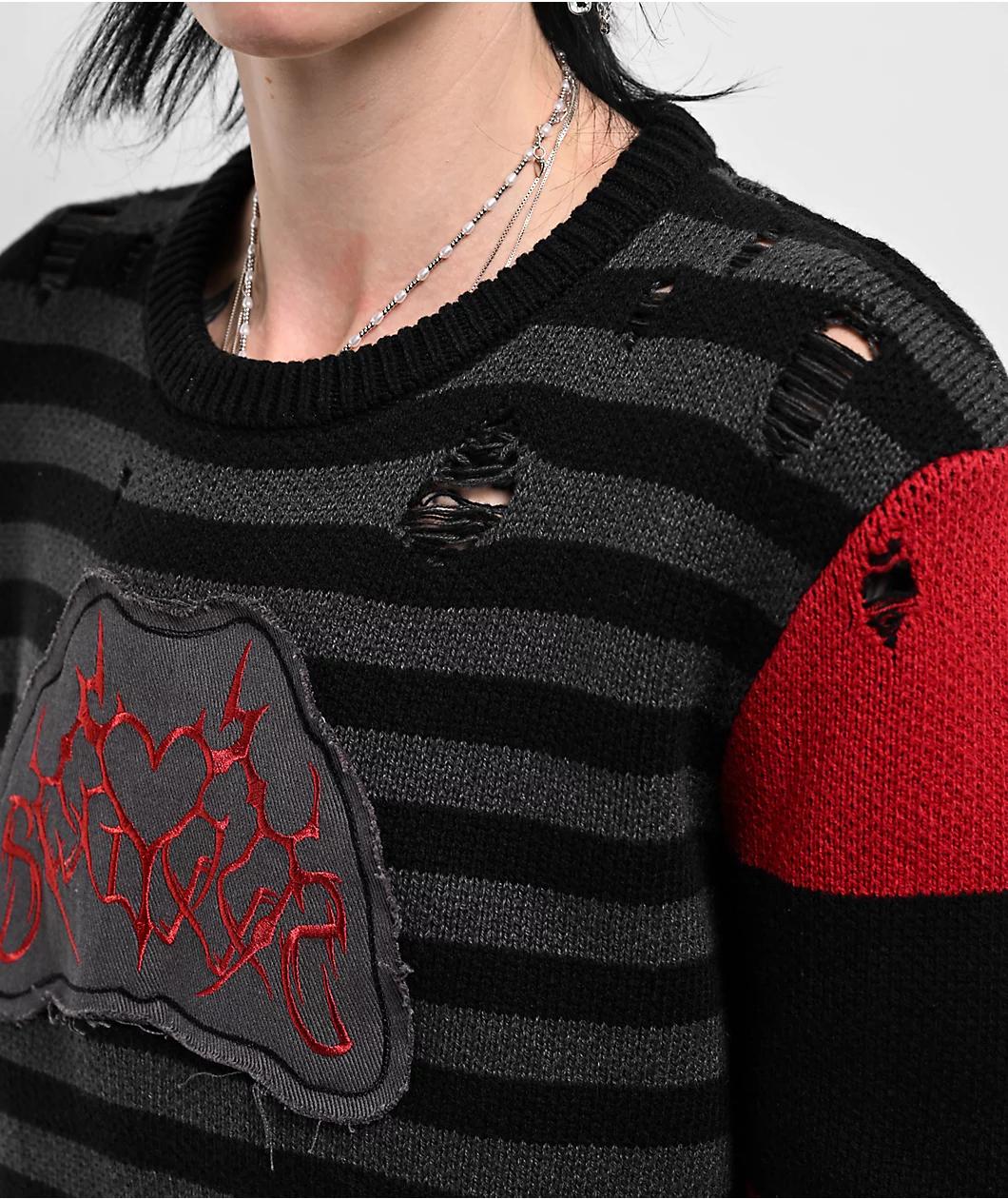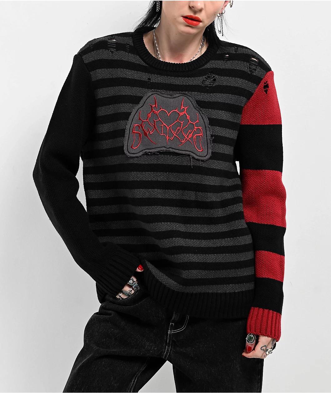 SWIXXZ presents the Cyber Heart sweater for a soft and comfortable addition to any outfit. A black and grey stripe pattern contrasts against the solid black right sleeve and wide red and black striped left sleeve for a one-of-a-kind look. Red cyber s