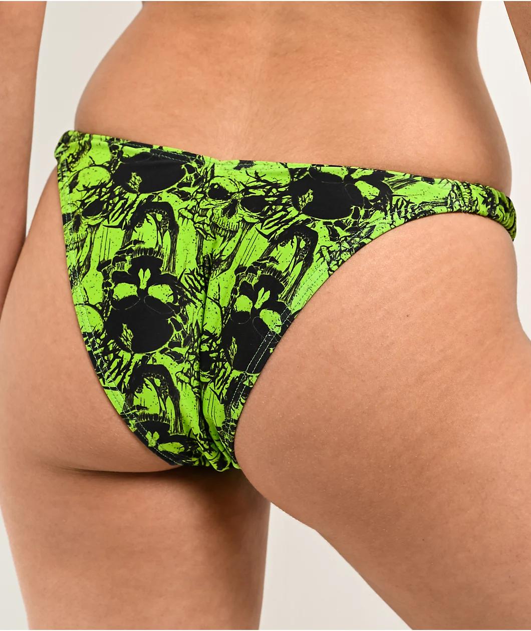 From Maggie Lindemann's SWIXXZ, the Grunge Skull bikini bottom features a haunting black and green print with skulls throughout. Made using 4 way stretch fabric with a soft inner lining, the high-cut design comes finished with elastic detailing along