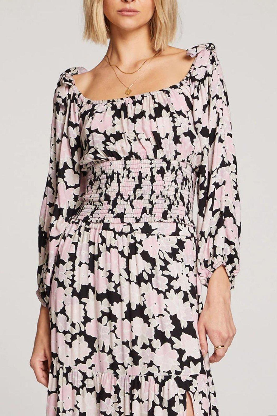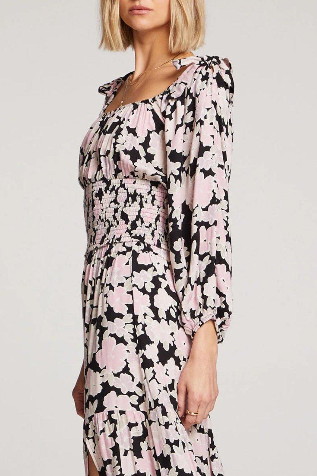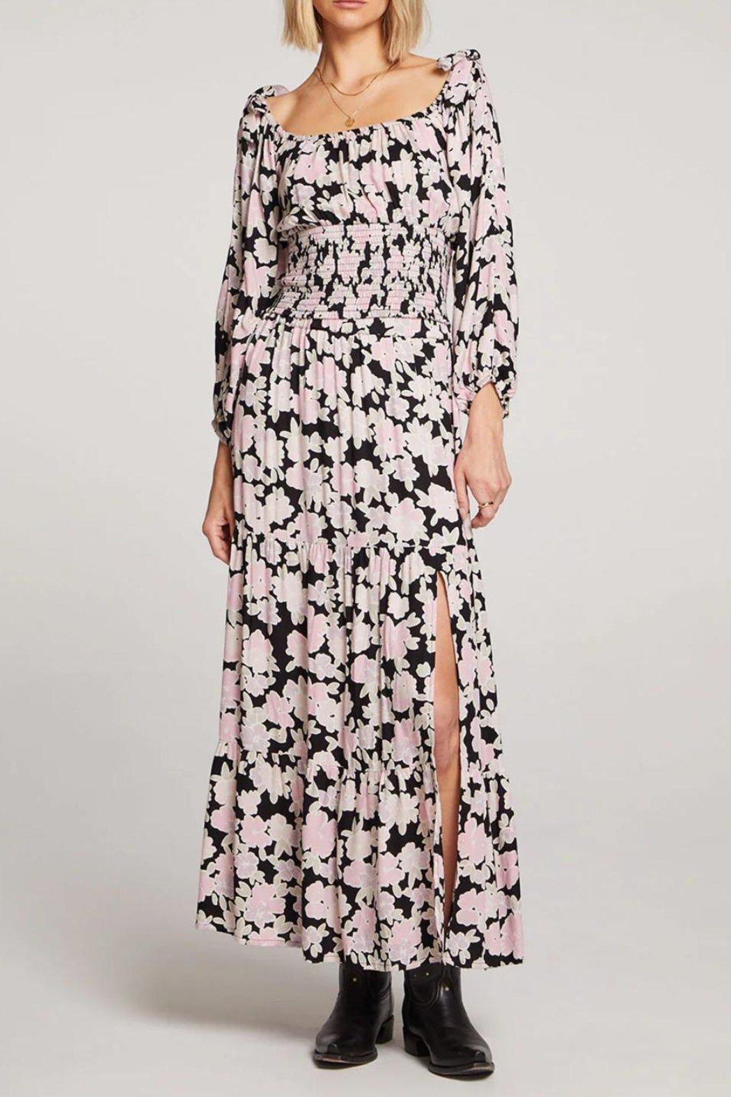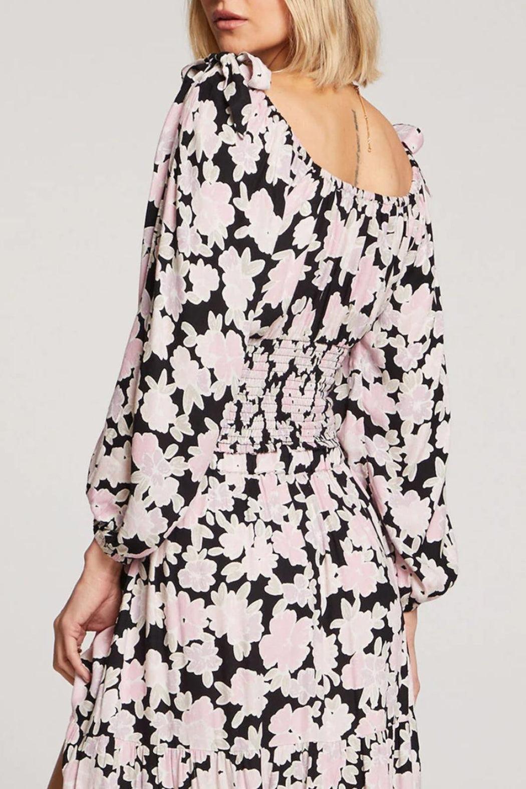 With a pattern of soft pink flowers blooming on a black backdrop, Kalini lends edge to a classic autumn botanical.