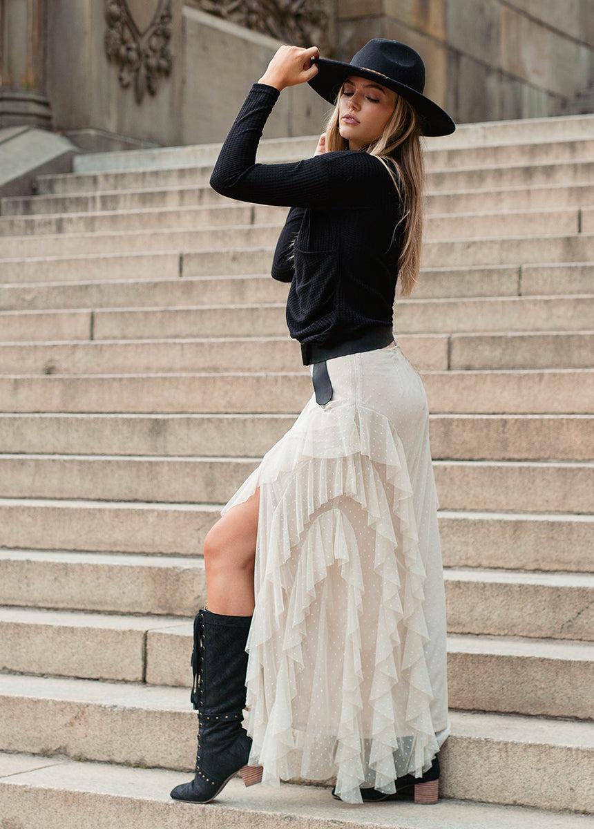 Discover the elegance of our Syana Skirt, inspired by our beloved Sylvia Dress. This stunning skirt features eye-catching vertical ruffles that add dynamic movement and texture, creating a flattering silhouette for both women and girls. The delicate dot mesh fabric enhances its boho charm, making it a perfect choice for both casual outings and special occasions. Elevate your wardrobe with this versatile skirt that combines boho style with modern flair. Maxi length Leg slit Fully lined Invisible zipper at side Self: 87% Nylon, 13% Spandex // Lining: 100% Polyester Hand wash only, line dry Model is 5'9 wearing an XS