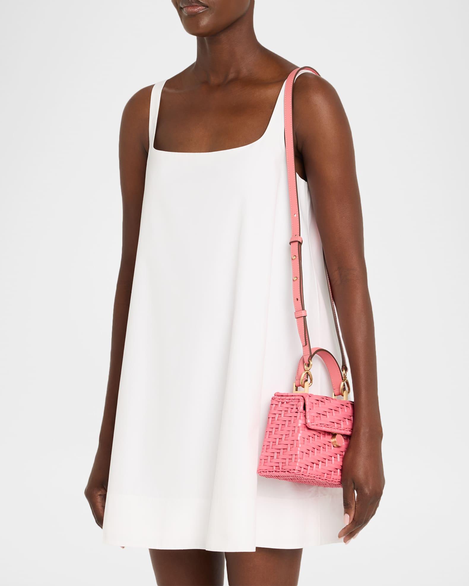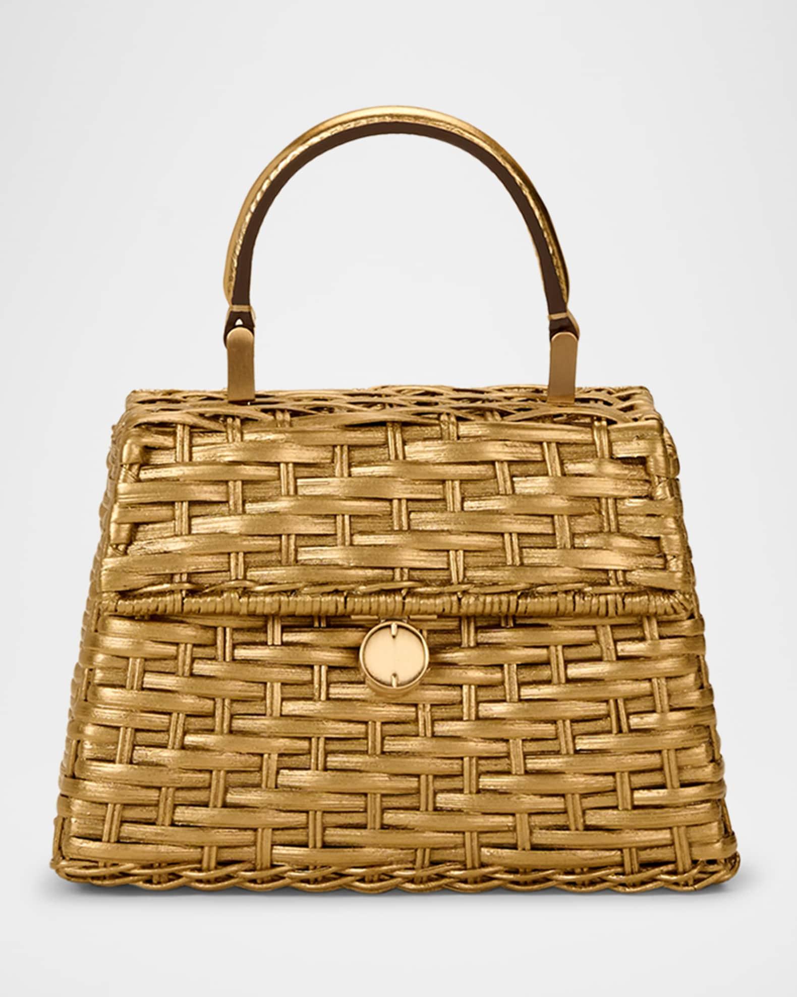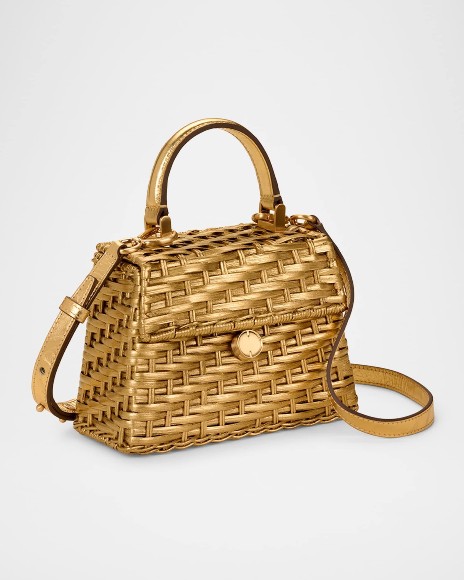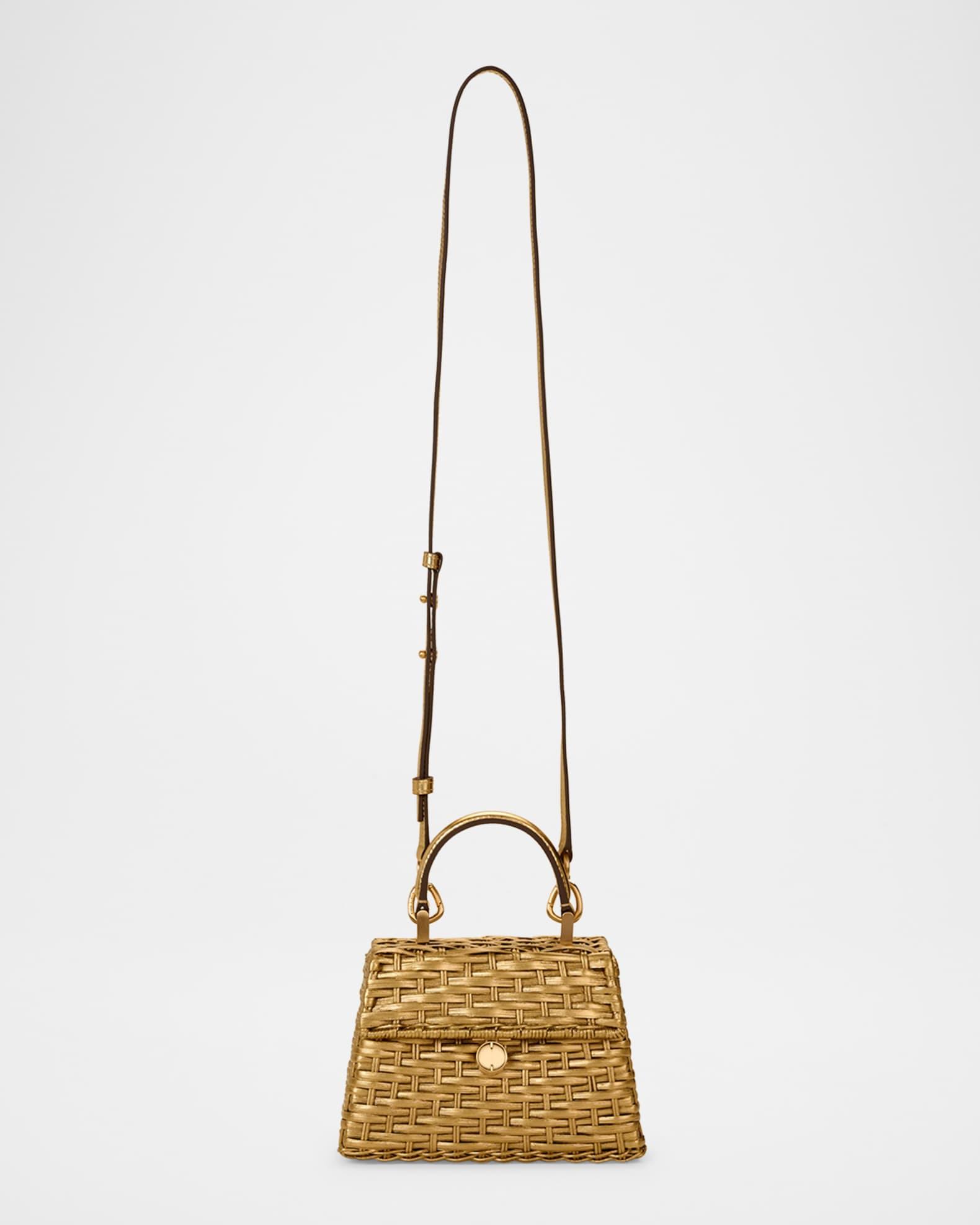 Cult Gaia "Sybil" crossbody bag in metallic woven leather and rattan Top handle Detachable, adjustable crossbody strap Can be worn as a top handle or crossbody bag Flap top with magnetic closure Lining: Cotton Approx. 5.1"H x 3.4"W x 3.5"D Brass Spot clean Imported