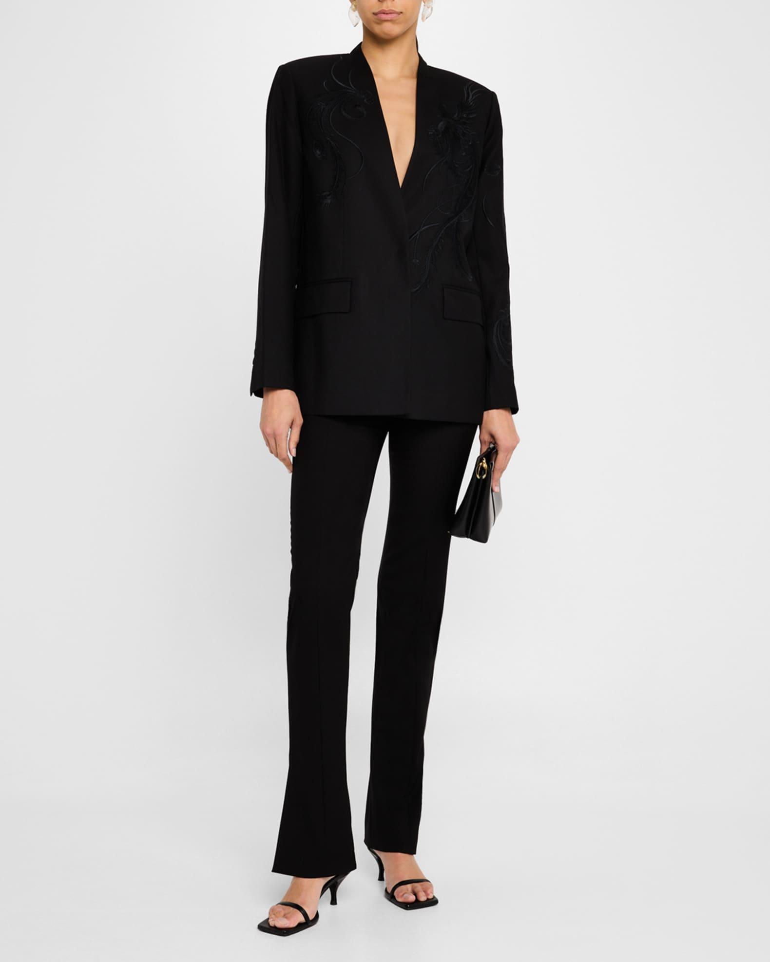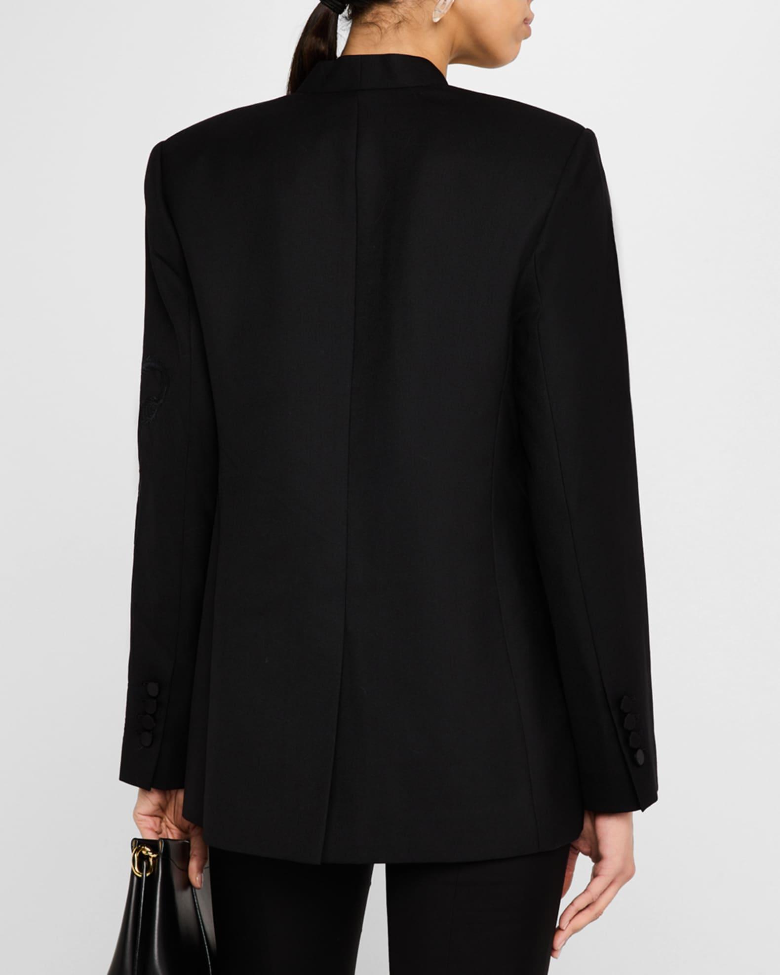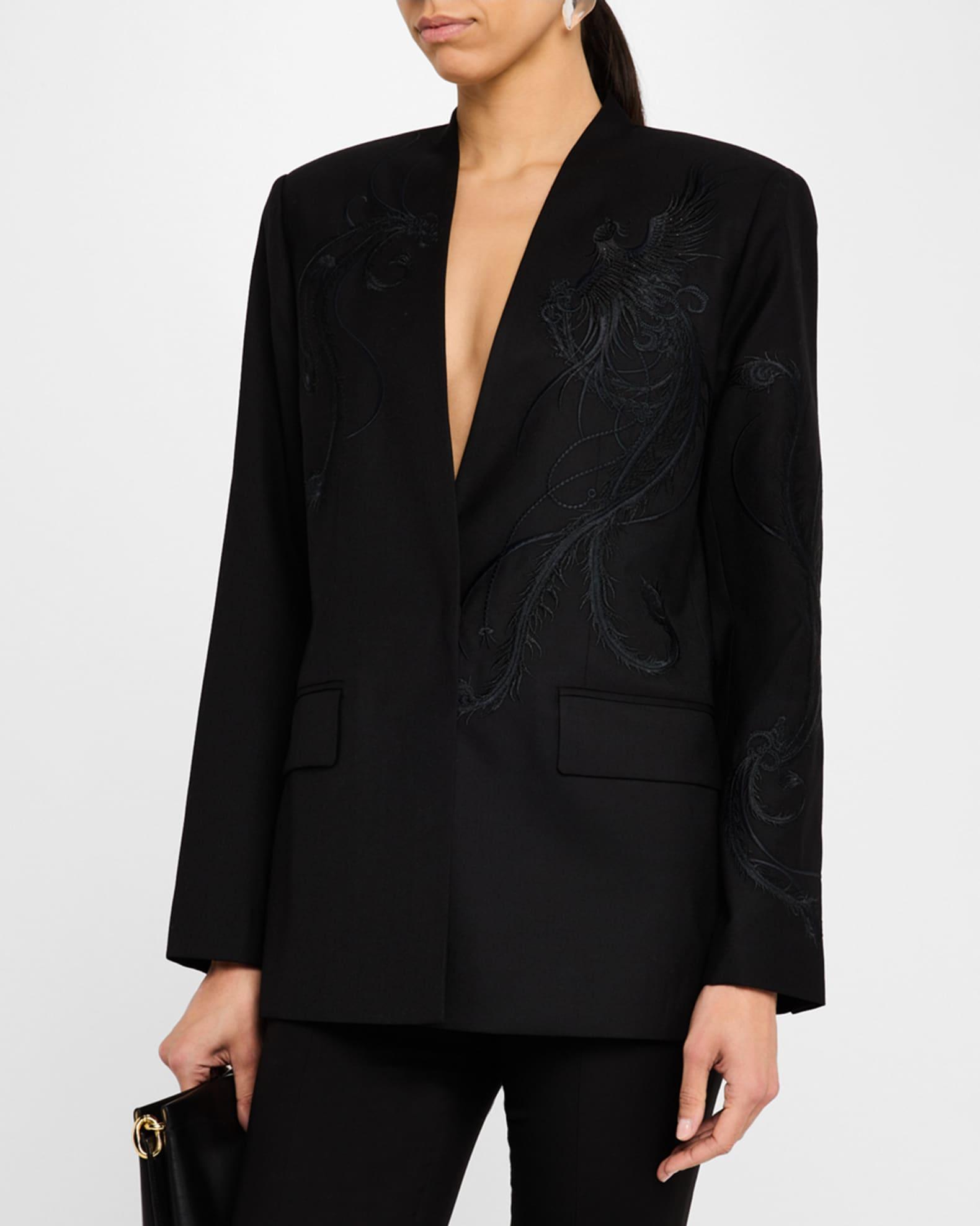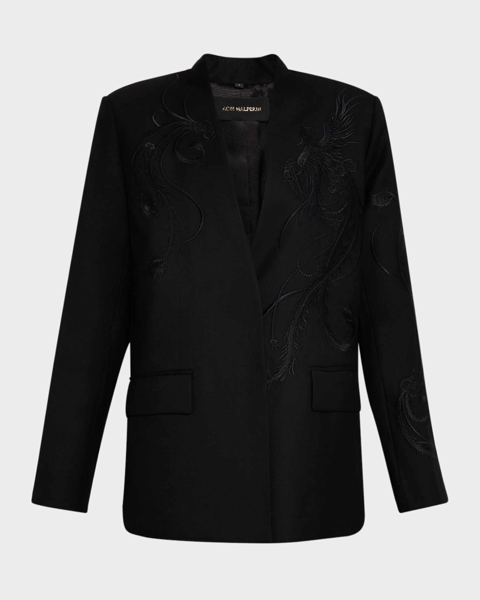 Kobi Halperin "Sydney" jacket with tonal bird embroidery Approx. 29"L from shoulders to hem V neckline Long sleeves Front flap pockets Center back vent Relaxed fit Polyester/wool Lining: Polyester/viscose Dry clean Imported Model is 5'10"/177cm.