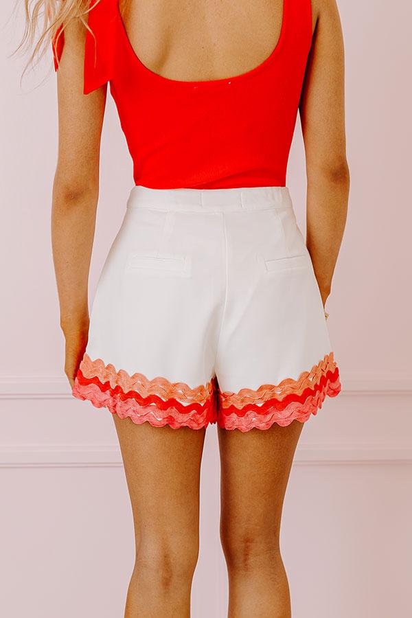 - Let your sunny disposition shine with these trendy shorts! - Fully lined material - A waistline with a hidden zip fly, hidden button and hook and eye closure - Faux pocket cut accents on the back - Scalloped accents featuring different orange hues - A figure flattering silhouette that ends in scalloped upper-thigh length hemlines