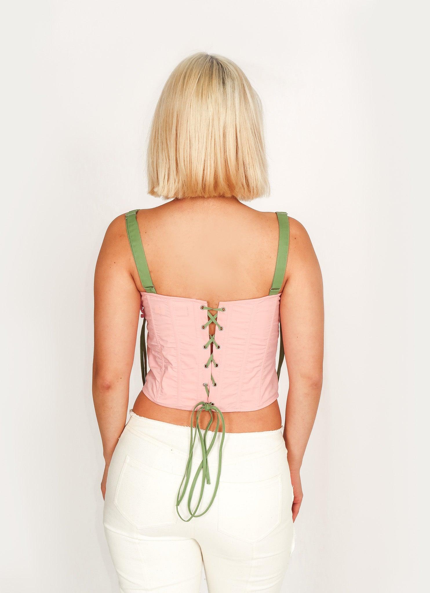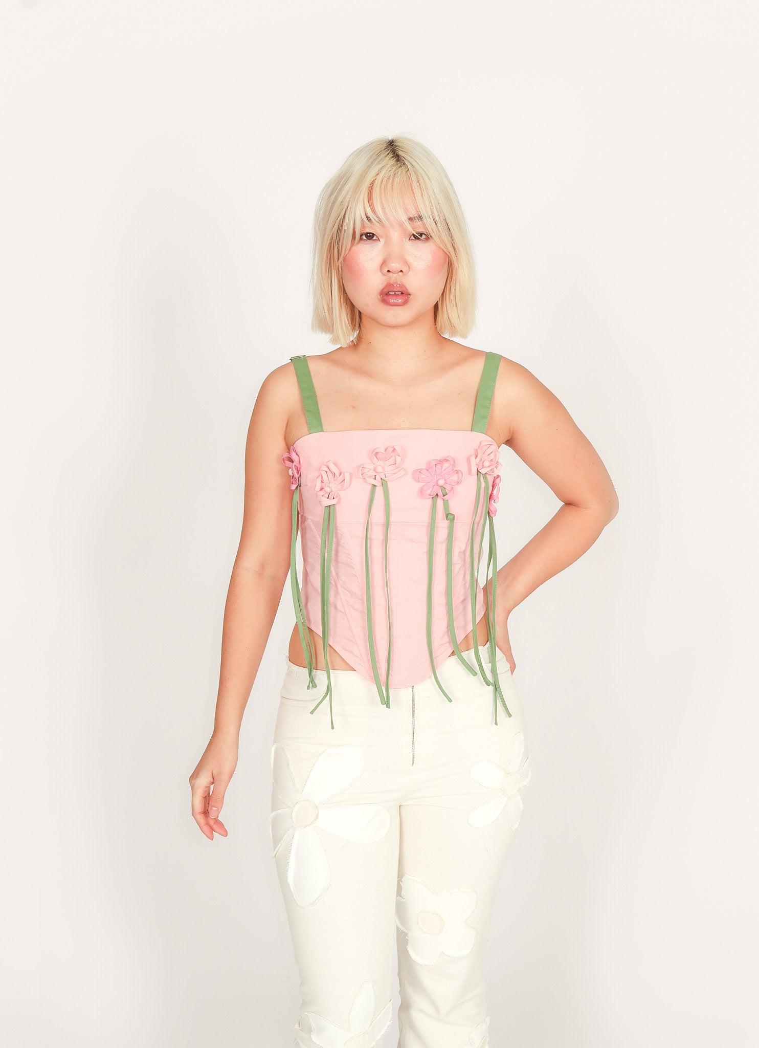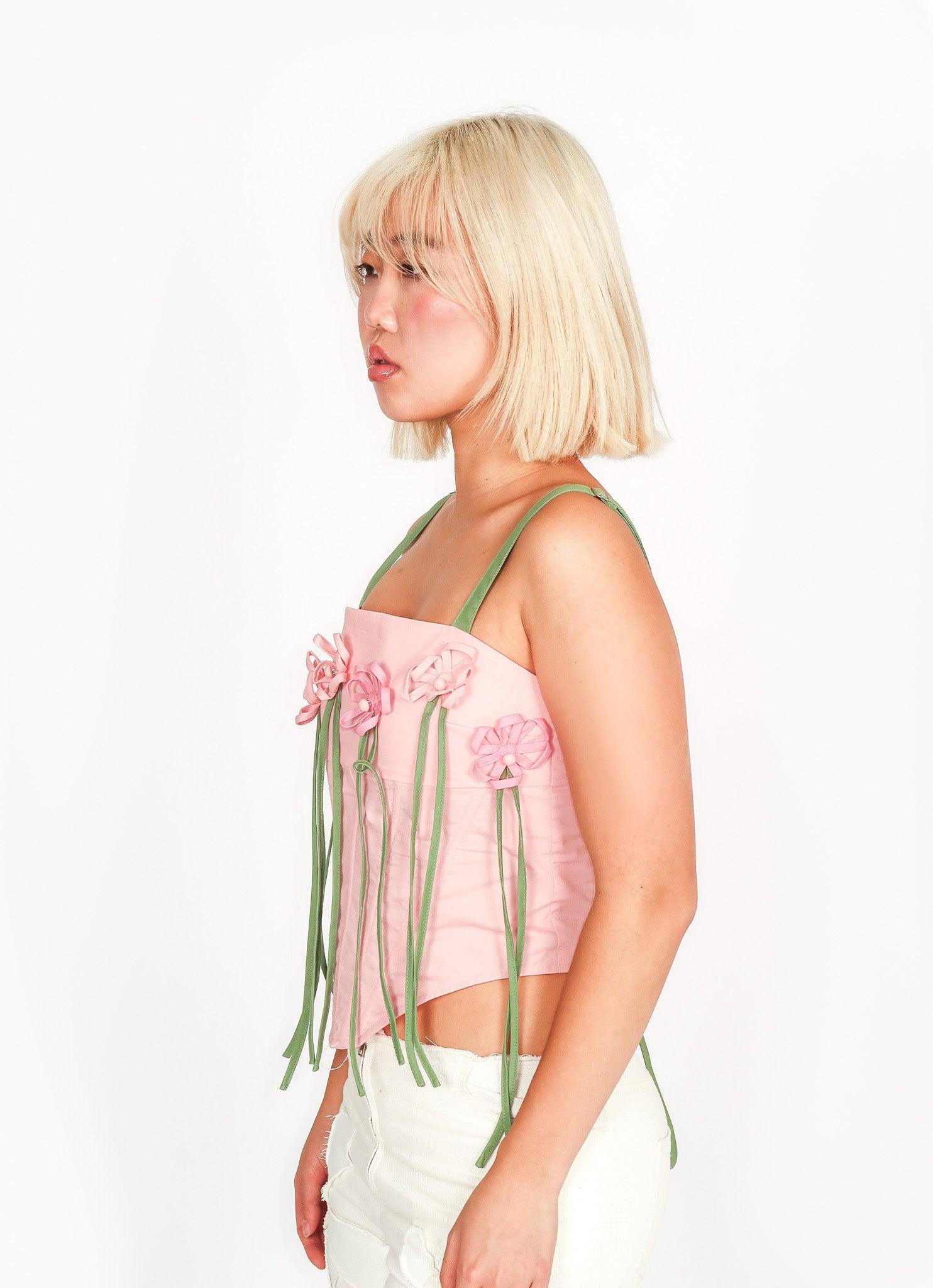 The Sylvia Ribbon Corset is for when you want to dress up while being effortless. The corset is in a blush pink with wide sage green straps. The neckline of the corset is adorned with pink 3D flowers and green ribbon hanging from them. The corset can be laced up in the back and is structured with boning to maintain a form fitting silhouette. Cha is 5"2' and is wearing a size XS.