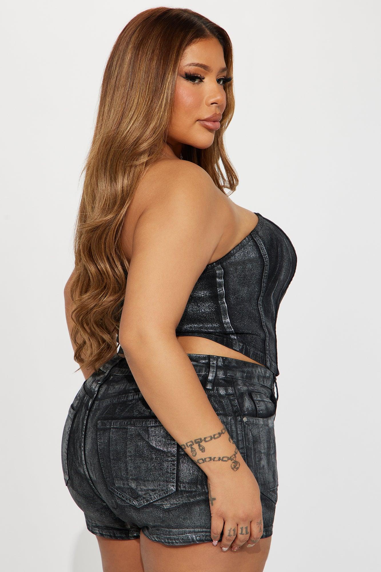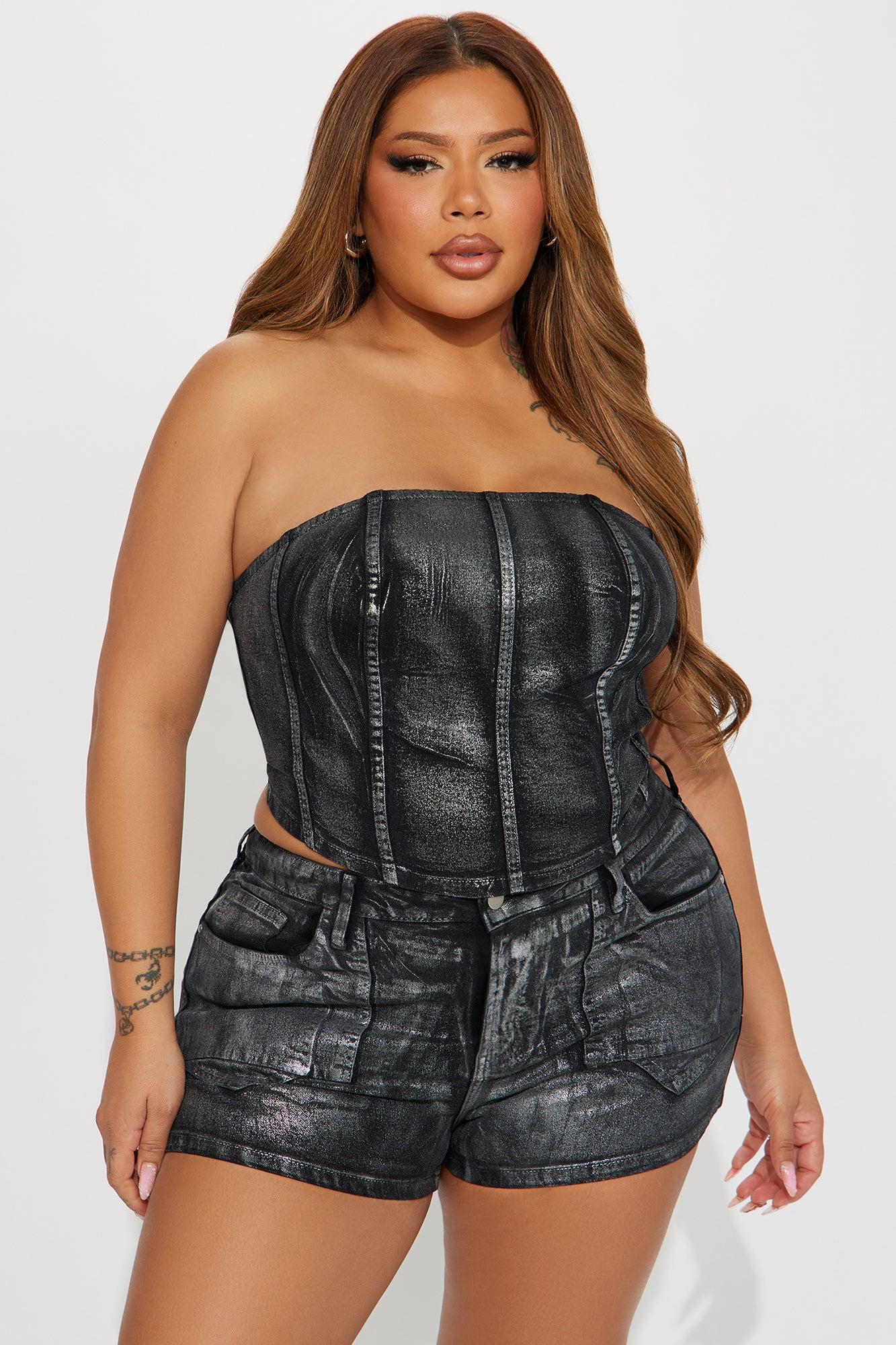 Available In Black. Pair With Sylvia Stretch Foil Denim Shorts Strapless Top Foil Print Zipper Closure High Stretch Disclaimer: Due To The Specialized Wash & Printing Process, Each Garment Is Unique. 70% Cotton 25% Polyester 3% Viscose 2% Spandex Imported California Proposition 65 WARNING: Cancer and Reproductive Harm - www.P65Warnings.ca.gov.