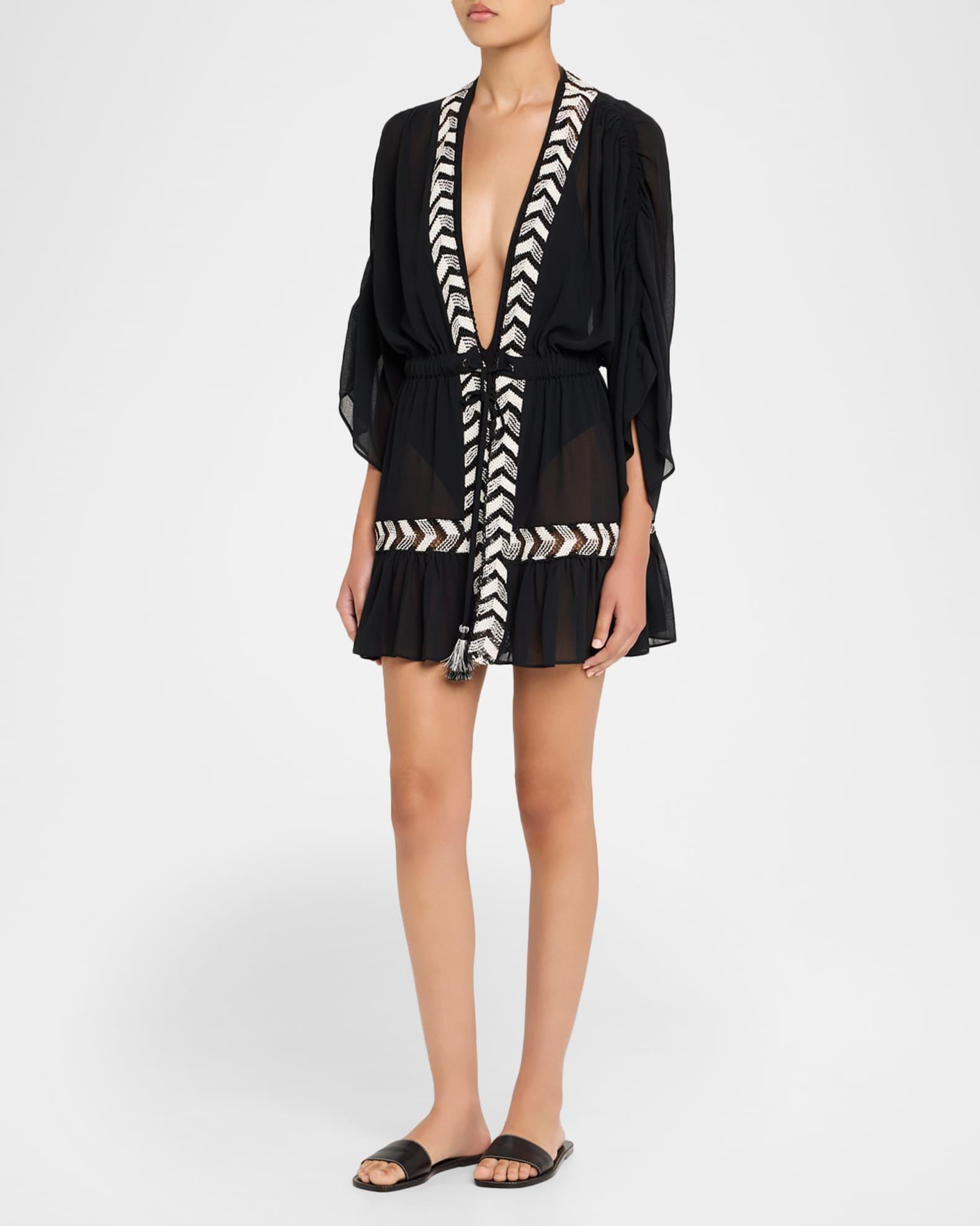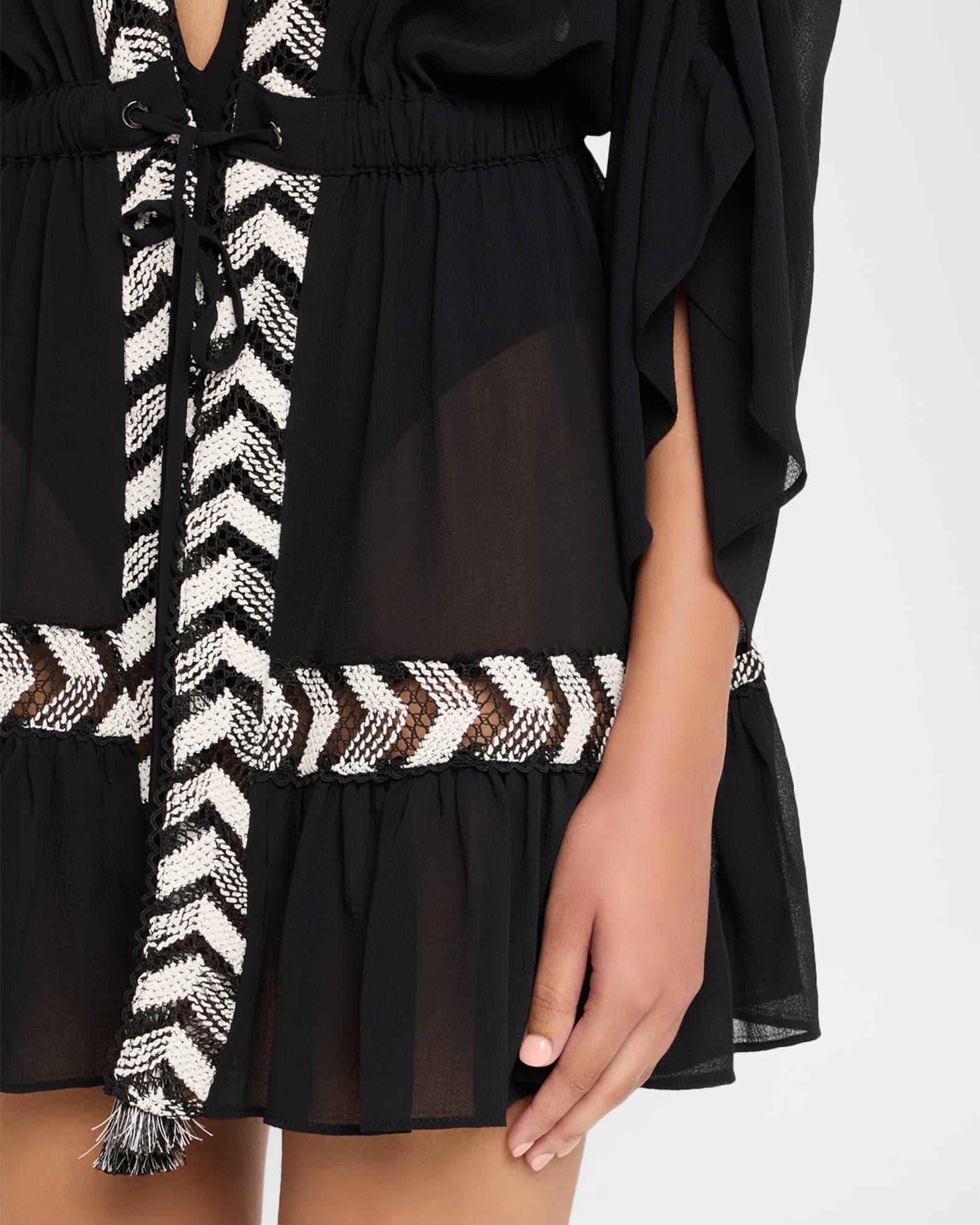 Ramy Brook "Sylvie" semi-sheer coverup dress embellished with chevron crochet trim Plunging V neckline Ruched 3/4 sleeves Self-tie drawstring waistband with tassel tie ends Hem falls above the knee Polyester Dry clean Imported